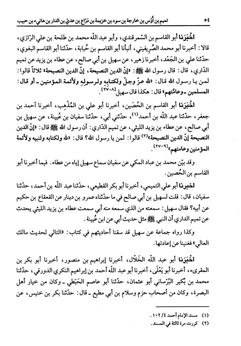 [2708] ح أخبرنا أبو القاسم بن الحصين أخبرنا أبو علي بن المذهب أخبرنا أحمد بن جعفر حدثنا عبد الله بن أحمد (1) حدثني أبي حدثنا سفيان بن عيينة عن سهيل بن أبي صالح عن عطاء بن يزيد الليثي عن تميم الداري أن رسول الله (صلى الله عليه وسلم) قال إن الدين النصيحة إن الدين النصيحة (2) قالوا لمن يا رسول الله قال لله ولكتابه ولنبيه ولأئمة المؤمنين وعامتهم