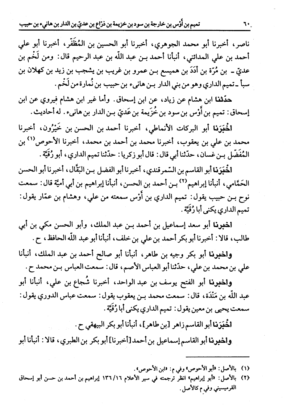 ناصر أخبرنا أبو محمد الجوهري أخبرنا أبو الحسين بن المظفر أخبرنا أبو علي أحمد بن علي المدائني أنبأنا أحمد بن عبد الله بن عبد الرحيم قال ومن لخم بن عدي بن مرة بن أدد بن هميسع بن عمرو بن غريب بن يشجب بن زيد بن كهلان بن سبأ تميم الداري وهو من بني الدار بن هانئ بن حبيب بن نمارة من لخم حدثنا ابن هشام عن زياد عن ابن اسحاق وأما غير ابن هشام فيروي عن ابن اسحاق تميم بن أوس بن سود بن خزيمة بن عدي بن الدار بن هانئ له أحاديث أخبرنا أبو البركات الأنماطي أخبرنا أحمد بن الحسن بن خيرون أخبرنا محمد بن علي بن يعقوب أخبرنا محمد بن أحمد بن محمد أخبرنا الأحوص (1) بن المفضل بن غسان حدثنا أبي قال قال أبو زكريا حدثنا تميم الداري أبو رقية أخبرنا أبو القاسم بن السمرقندي أخبرنا الفضل بن البقال أخبرنا أبو الحسن الحمامي أنبأنا إبراهيم (2) بن احمد بن الحسن أنبأنا إبراهيم بن أبي أمية قال سمعت نوح بن حبيب يقول تميم الداري بن أوس بن سمعته من علي وهشام بن عمار يقول تميم الداري يكنى أبا رقية أخبرنا أبو سعد إسماعيل بن أحمد بن عبد الملك وأبو الحسن مكي بن أبي طالب قالا أخبرنا أبو بكر أحمد بن علي بن خلف أنبأنا أبو عبد الله الحافظ ح وأخبرنا أبو بكر وجيه بن طاهر أنبأنا أبو صالح أحمد بن عبد الملك أنبأنا علي بن محمد بن علي حدثنا أبو العباس الأصم قال سمعت العباس بن محمد ح وأخبرنا أبو الفتح يوسف بن عبد الواحد أخبرنا شجاع بن علي أنبأنا أبو عبد الله بن مندة قال سمعت محمد بن يعقوب يقول سمعت عباس الدوري يقول سمعت يحيى بن معين يقول تميم الداري يكنى أبا رقية أخبرنا أبو القاسم زاهر بن طاهر أنبأنا أبو بكر البيهقي ح وأخبرنا أبو القاسم إسماعيل بن أحمد أخبرنا أبو بكر بن الطبري قالا أنبأنا أبو