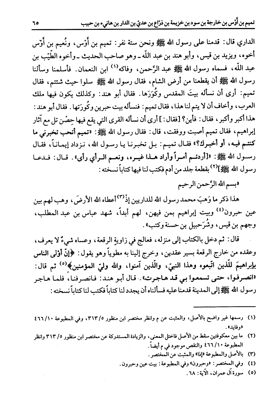 الداري قال قدمنا على رسول الله (صلى الله عليه وسلم) ونحن ستة نفر تميم بن أوس ونعيم بن أوس أخوه ويزيد بن قيس وأبو هند بن عبد الله وهو صاحب الحديث وأخوه الطيب بن عبد الله فسماه رسول الله (صلى الله عليه وسلم) عبد الرحمن وفاكه (1) بن النعمان فأسلمنا وسألنا رسول الله (صلى الله عليه وسلم) أن يقطعنا من أرض الشام فقال رسول الله (صلى الله عليه وسلم) سلو حيث شئتم فقال تميم أرى أن نسأله بيت المقدس وكورها فقال أبو هند وكذلك يكون فيها ملك العرب وأخاف أن لا يتم لنا هذا فقال تميم فنسأله بيت حبرين وكورتها فقال أبو هند هذا أكبر وأكرفقال فأين فقال أرى أن نسأله القرى التي يقع فيها حصن تل مع آثار إبراهيم فقال تميم أصبت ووفقت قال فقال رسول الله (صلى الله عليه وسلم) تميم أتحب أن تخبرني ما كنتم فيه أو أخبرك فقال تميم بل تخبرنا يا رسول الله نزداد إيمانا فقال رسول الله (صلى الله عليه وسلم) أردتم أمرا وأراد هذا غيره ونعم الرأي رأى قال فدعا رسول (صلى الله عليه وسلم) (2) بقطعة جلد من أدم فكتب لنا فيها كتابا نسخته بسم الله الرحمن الرحيم هذا ذكر ما وهب محمد رسول الله للداريين إذ (3) أعطاه الله الأرض وهب لهم بين عين حبرون (4) وبيت إبراهيم بمن فيهن لهم أبدا شهد عباس بن عبد المطلب وجهم بن قيس وشرحبيل بن حسنة وكتب قال ثم دخل بالكتاب إلى منزله فعالج في زاوية الرقعة وعساه شئ لا يعرف وعقده من خارج الرقعة بسير عقدين وخرج إلينا به مطويا وهو يقول " إن أولى الناس بإبراهيم للذين اتبعوه وهذا النبي والذين آمنوا والله ولي المؤمنين (5) " ثم قال انصرفوا حتى تسمعوا بي قد هاجرت قال أبو هند فانصرفنا فلما هاجر رسول الله (صلى الله عليه وسلم) إلى المدينة قدمنا عليه فسألناه أن يجدد لنا كتابا فكتب لنا كتابا نسخته