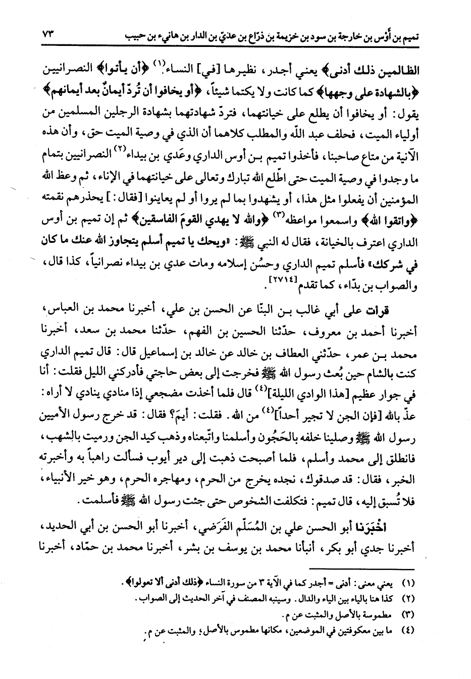 الظالمين ذلك أدنى " يعني أجدر نظيرها في النساء (1) " أن يأتوا " النصرانيين بالشهادة على وجهها " كما كانت ولا يكتما شيئا " أو يخافوا أن ترد أيمان بعد أيمانهم " يقول أو يخافوا أن يطلع على خيانتهما فترد شهادتهما بشهادة الرجلين المسلمين من أولياء الميت فحلف عبد الله والمطلب كلاهما أن الذي في وصية الميت حق وان هذه الآنية من متاع صاحبنا فأخذوا تميم بن أوس الداري وعدي بن بيداء (2) النصرانيين بتمام ما وجدوا في وصية الميت حتى أطلع الله تبارك وتعالى على خيانتهما في الإناء ثم وعظ الله المؤمنين أن يفعلوا مثل هذا أو يشهدوا بما لم يروا أو لم يعاينوا فقال يحذرهم نقمته " واتقوا الله " واسمعوا مواعظه (3) " والله لا يهدي القوم الفاسقين " ثم إن تميم بن أوس الداري اعترف بالخيانة فقال له النبي (صلى الله عليه وسلم) ويحك يا تميم أسلم يتجاوز الله عنك ما كان في شركك ح فأسلم تميم الداري وحسن إسلامه ومات عدي بن بيداء نصرانيا كذا قال والصواب بن بداء كما تقدم