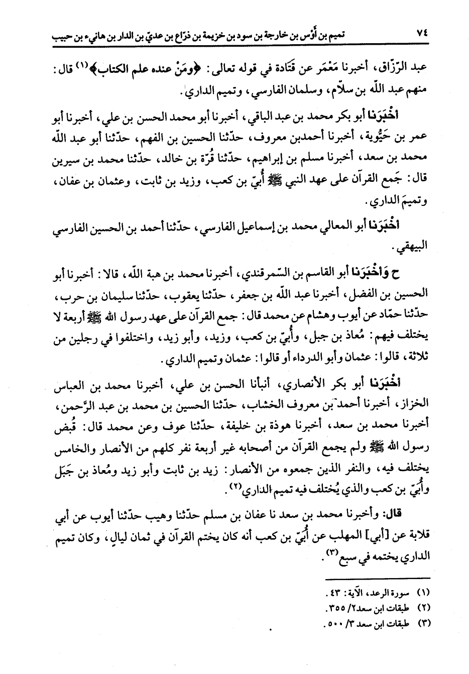 عبد الرزاق أخبرنا معمر عن قتادة في قوله تعالى " ومن عنده علم الكتاب (1) " قال منهم عبد الله بن سلام وسلمان الفارسي وتميم الداري اخبرنا أبو بكر محمد بن عبد الباقي أخبرنا أبو محمد الحسن بن علي أخبرنا أبو عمر بن حيوية أخبرنا أحمد بن معروف حدثنا الحسين بن الفهم حدثنا أبو عبد الله محمد بن سعد أخبرنا مسلم بن إبراهيم حدثنا قرة بن خالد حدثنا محمد بن سيرين قال جمع القرآن على عهد النبي (صلى الله عليه وسلم) أبي بن كعب وزيد بن ثابت وعثمان بن عفان وتميم الداري أخبرنا أبو المعالي محمد بن إسماعيل الفارسي حدثنا أحمد بن الحسين الفارسي البيهقي ح وأخبرنا أبو القاسم بن السمرقندي أخبرنا محمد بن هبة الله قالا أخبرنا أبو الحسين بن الفضل أخبرنا عبد الله بن جعفر حدثنا يعقوب حدثنا سليمان بن حرب حدثنا حماد عن أيوب وهشام عن محمد قال جمع القرآن على عهد رسول الله (صلى الله عليه وسلم) أربعة لا يختلف فيهم معاذ بن جبل وأبي بن كعب وزيد وأبو زيد واختلفوا في رجلين من ثلاثة قالوا عثمان وأبو الدرداء أو قالوا عثمان وتميم الداري أخبرنا أبو بكر الأنصاري أنبأنا الحسن بن علي أخبرنا محمد بن العباس الخزاز أخبرنا أحمد بن معروف الخشاب حدثنا الحسين بن محمد بن عبد الرحمن أخبرنا محمد بن سعد أخبرنا هوذة بن خليفة حدثنا عوف وعن محمد قال قبض رسول الله (صلى الله عليه وسلم) ولم يجمع القرآن من أصحابه غير أربعة نفر كلهم من الأنصار والخامس يختلف فيه والنفر الذين جمعوه من الأنصار زيد بن ثابت وأبو زيد ومعاذ بن جبل وأبي بن كعب والذي يختلف فيه تميم الداري (2) قال وأخبرنا محمد بن سعدنا عفان بن مسلم حدثنا وهيب حدثنا أيوب عن أبي قلابة عن أبي المهلب عن أبي بن كعب أنه كان يختم القرآن في ثمان ليال وكان تميم الدار ييختمه في سبع (3)