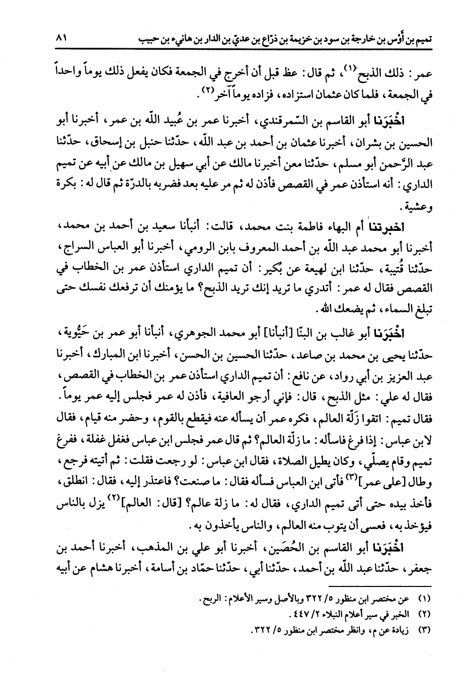 عمر ذلك الذبح (1) ثم قال عظ قبل أن خرج في الجمعة فكان يفعل ذلك يوما واحدا في الجمعة فلما كان عثمان استزاده فزاده يوما آخر (2) أخبرنا أبو القاسم بن السمرقندي أخبرنا عمر بن عبيد الله بن عمر أخبرنا أبو الحسين بن بشران أخبرنا عثمان بن أحمد بن عبد الله حدثنا حنبل بن إسحاق حدثنا عبد الرحمن أبو مسلم حدثنا معن أخبرنا مالك عن أبسهيل بن مالك عن أبيه عن تميم الداري أنه استأذن عمر في القصص فأذن له ثم مر عليه بعد فضربه بالدرة ثم قال له بكرة وعشية أخبرتنا أم البهاء فاطمة بنت محمد قالت أنبأنا سعيد بن أحمد بن محمد أخبرنا أبو محمد عبد الله بن أحمد المعروف بابن الرومي أخبرنا أبو العباس السراج حدثنا قتيبة حدثنا ابن لهيعة عن بكير أن تميم الداري استأذن عمر بن الخطاب في القصص فقال له عمر أتدري ما تريد إنك تريد الذبح ما يؤمنك أن ترفعك نفسك حتى تبلغ السماء ثم يضعك الله أخبرنا أبو غالب بن البنا أنبأنا أبو محمد الجوهري أنبأنا أبو عمر بن حيوية حدثنا يحيى بن محمد بن صاعد حدثنا الحسين بن الحسن أخبرنا ابن المبارك أخبرنا عبد العزيز بن أبي رواد عن نافع أن تميم الداري استأذن عمر بن الخطاب في القصص فقال له علي مثل الذبح قال فإني أرجو العافية فأذن له عمر فجلس إليه عمر يوما فقال تميم اتقوا زلة العالم فكره عمر أن يسأله عنه فيقطع بالقوم وحضر منه قيافقال لابن عباس إذا فرغ فاسأله ما زلة العالم ثم قال عمر فجلس ابن عباس فغفل غفلة ففرغ تميم وقام يصلي وكان يطيل الصلاة فقال ابن عباس لو رجعت فقلت ثم أتيته فرجع وطال على عمر (3) فأتى ابن العباس فسأله فقال ما صنعت فاعتذر إليه فقال انطلق فأخذ بيده حتى أتى تميم الداري فقال له ما زلة عالم قال العالم (2) يز بالناس فيؤخذ به فعسى أن يتوب منه العالم والناس يأخذون به أخبرنا أبو القاسم بن الحصين أخبرنا أبو علي بن المذهب أخبرنا أحمد بن جعفر حدثنا عبد الله بن أحمد حدثنا أبي حدثنا حماد بن أسامة أخبرنا هشام عن أبيه