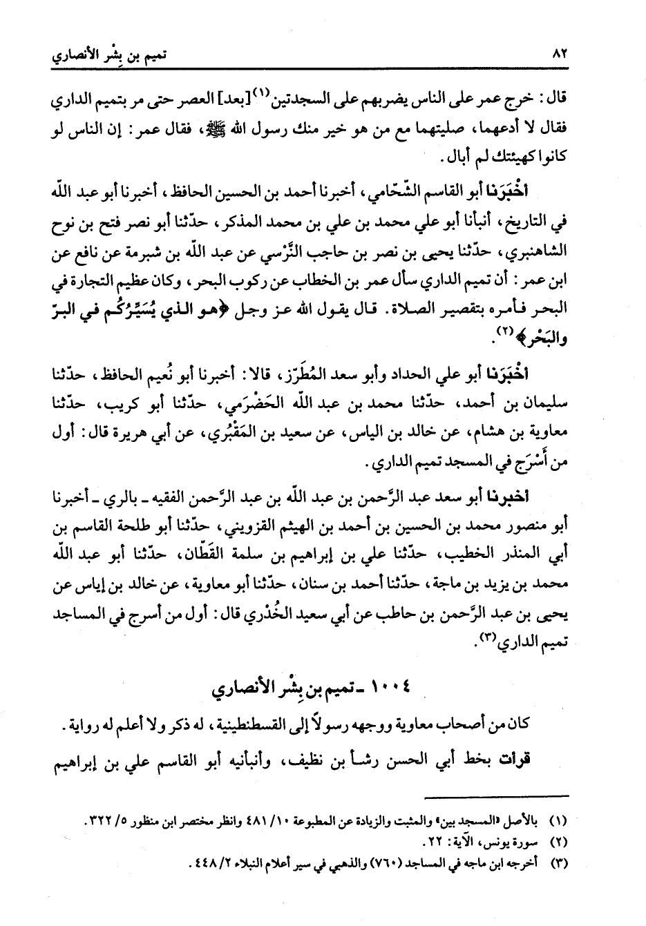 قال خرج عمر على الناس يضربهم على السجدتين (1) بعد العصر حتى مر بتميم الداري فقال لا أدعهما صليتهما مع من هو خير منك رسول الله (صلى الله عليه وسلم) فقال عمر إن الناس لو كانوا كهيئتك لم أبال أخبرنا أبو القاسم الشحامي أخبرنا أحمد بن الحسين الحافظ أخبرنا أبو عبد الله في التاريخ أنبانا أبو علي محمد بن علي بن محمد المذكر حدثنا أبو نصر فتح بن نوح الشاهنبري حدثنا يحيى بن نصر بن حاجب النرسي عن عبد الله بن شبرمة عن نافع عن ابن عمر أن تميم الداري سأل عمر بن الخطاب عن ركوب البحر وكان عظيم التجارة في البحر فأمره بتقصير الصلاة قال يقول الله عز وجل " هو الذي يسيركم في البر والبحر (2) " أخبرنا أبو علي الحداد وأبو سعد المطرز قالا أخبرنا أبو نعيم الحافظ حدثنا سليمان بن أحمد حدثنا محمد بن عبد الله الحضرمي حدثنا أبو كريب حدثنا معاوية بن هشام عن خالد بن الياس عن سعيد بن المقبري عن أبي هريرة قال أول من أسرج في المسجد تميم الداري أخبرنا أبو سعد عبد الرحمن بن عبد الله بن عبد الرحمن الفقيه بالري أخبرنا أبو منصور محمد بن الحسين بن أحمد بن الهيثم القزويني حدثنا أبو طلحة القاسم بن أبي المنذر الخطيب حدثنا علي بن إبراهيم بن سلمة القطان حدثنا أبو عبد الله محمد بن يزيد بن ماجة حثنا أحمد بن سنان حدثنا أبو معاوية عن خالد بن إياس عن يحيى بن عبد الرحمن بن حاطب عن أبي سعيد الخدري قال أول من أسرج في المساجد تميم الداري (3)