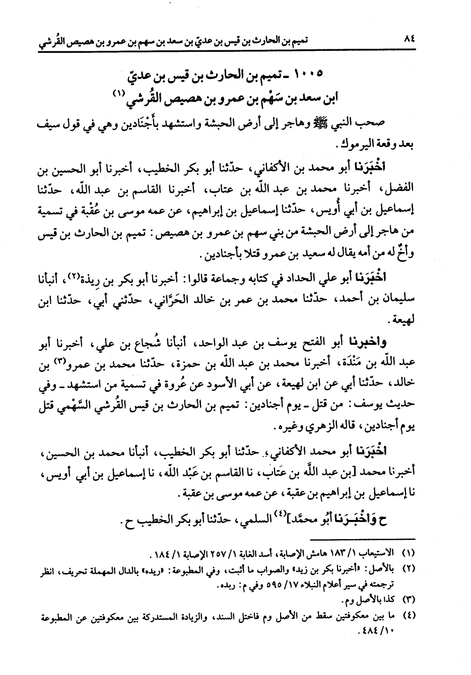 1005 - تميم بن الحارث بن قيس بن عدي ابن سعد بن سهم بن عمرو بن هصيص القرشي (1) صحب النبي (صلى الله عليه وسلم) وهاجر إلى أرض الحبشة واستشهد بأجنادين وهي في قول سيف بعد وقعة اليرموك أخبرنا أبو محمد بن الأكفاني حدثنا أبو بكر الخطيب أخبرنا أبو الحسين بن الفضل أخبرنا محمد بن عبد الله بن عتاب أخبرنا القاسم بن عبد الله حدثنا إسماعيل بن أبي أويس حدثنا إسماعيل بن إبراهيم عن عمه موسى بن عقبة في تسمية من هاجر إلى أرض الحبشة من بني سهم بن عمرو بن هصيص تميم بن الحارث بن قيس وأخ له من أمه يقال له سعيد بن عمرو قتلا بأجنادين أخبرنا أبو علي الحداد في كتابه وجماعة قالوا أخبرنا أبو بكر بن ريذة (2) أنبأنا سليمان بن أحمد حدثنا محمد بن عمر بن خالد الحراني حدثني أبي حدثنا ابن لهيعة وأخبرنا أبو الفتح يوسف بن عبد الواحد أنبأنا شجاع بن علي أخبرنا أبو عبد الله بن مندة أخبرنا محمد بن عبد الله بن حمزة حدثنا محمد بن عمرو (3) بن خالد حدثنا أبي عن أبن لهيعة عن أبي الأسود عن عروة في تسمية من استشهد وفي حديث يوسف من قتل يوم أجنادين تميم بن الحارث بن قيس القرشي السهمي قتل يوم أجنادين قاله الزهري وغيره أخبرنا أبو محمد الأكفاني حدثنا أبو بكر الخطيب أنبأنا محمد بن الحسين أخبرنا محمد بن عبد الله بن عتاب نا القاسم بن عبد الله نا إسماعيل بن أبي أويس نا إسماعيل بن إبراهيم بن عقبة عن عمه موسى بن عقبة ح وأخبرنا أبو محمد (4) السلمي حدثنا أبو بكر الخطيب ح
