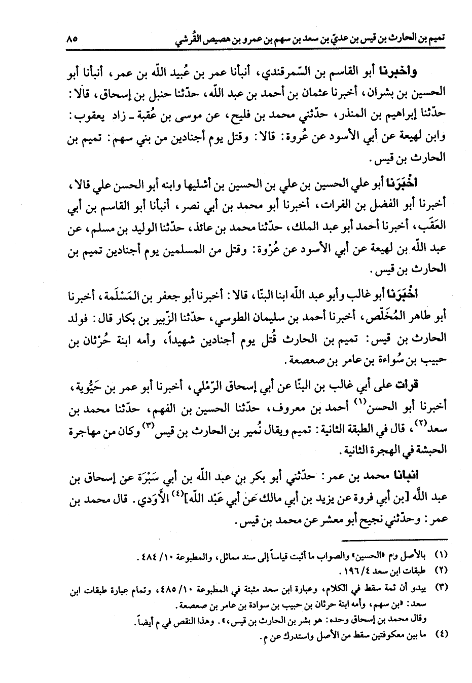 وأخبرنا أبو القاسم بن السمرقندي أنبأنا عمر بن عبيد الله بن عمر أنبأنا أبو الحسين بن بشران أخبرنا عثمان بن أحمد بن عبد الله حدثنا حنبل بن إسحاق قالا حدثنا إبراهيم بن المنذر حدثني محمد بن فليح عن موسى بن عقبة زاد يعقوب وابن لهيعة عن أبي الأسود عن عروة قالا وقتل يوم أجنادين من بني سهم تميم بن الحارث بن قيس أخبرنا أبو علي الحسين بن علي بن الحسين بن أشليها وابنه أبو الحسن علي قالا أخبرنا أبو الفضل بن الفرات أخبرنا أبو محمد بن أبي نصر أنبأنا أبو القاسم بن أبي العقب أخبرنا أحمد أبو عبد الملك حدثنا محمد بن عائذ حدثنا الوليد بن مسلم عن عبد الله بن لهيعة عن أبي الأسود عن عروة وقتل من المسلمين يوم أجنادين تميم بن الحارث بن قيس أخبرنا أبو غالب وأبو عبد الله ابنا البنا قالا أخبرنا أبو جعفر بن المسلمة أحبرنا أبو طاهر المخلص أخبرنا أحمد بن سليمان الطوسي حدثنا الزبير بن بكار قال فولد الحارث بن قيس تميم بن الحارث قتل يوم أجنادين شهيدا وأمه ابنة حرثان بن حبيب بن سواءة بن عامر بن صعصعة قرأت على أبي غالب بن البنا عن أبي إسحاق الرملي أخبرنا أبو عمر بن حيوية أخبرنا أبو الحسن (1) أحمد بن معروف حدثنا الحسين بن الفهم حدثنا محمد بن سعد (2) قال في الطبقة الثانية تميم ويقال نمير بن الحارث بن قيس وكان من مهاجرة الحبشة في الهجرة الثانية أنبأنا محمد بن عمر حدثني أبو بكر بن عبد الله بن أبي سبرة عن إسحاق بن عبد الله بن أبي فروة عن يزيد بن أبي مالك عن أبي (4) عبد الله الأودي قال محمد بن عمر وحدثني نجيح أبو معشر عن محمد بن قيس