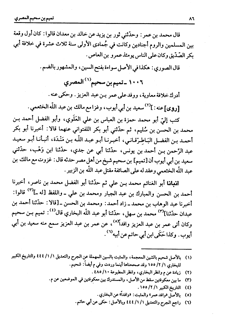1006 - تميم بن سحيم (1) المصري أدرك خلافة معاوية ووفد على عمر بن عبد العزيز وحكى عنه روى عنه (2) سعيد بن أبي أيوب وغزا مع مالك عبد الله الخثعمي كتب إلي أبو محمد حمزة بن العباس بن علي العلوي وأبو الفضل أحمد بن محمد بن الحسن بن سليم ثم حدثني أبو بكر اللفتواني عنهما قالا أخبرنا أبو بكر أحمد بن الفضل الباطرقاني أخبرنا أبو عبد الله بن مندة أنبأنا أبو سعيد عبد الرحمن بن أحمد بن يونس حدثنا أبي عن جدي حدثنا ابن وهب حدثني سعيد بن أبي أيوب أن تميم بن سحيم شيخ من أهل مصر حدثه قال غزوت مع مالك بن عبد الله الخثعمي وعقد له على الصائفة مقتل عبد الله بن الزبير أنبأنا أبو الغنائم محمد بن علي ثم حدثنا أبو الفضل محمد بن ناصر أخبرنا أحمد بن الحسن والمبارك بن عبد الجبار ومحمد بن علي واللفظ (3) له قالوا أخبرنا عبد الوهاب بن محمد زاد أحمد ومحمد بن الحسن قالا حدثنا أحمد بن عبدان حدثنا (3) محمد بن سهل حدثنا أبو عبد الله البخاري قال (4) تميم بن سحيم وكان أتى عمر بن عبد العزيز وافدا (5) عن عمر بن عبد العزيز سمع منه سعيد بن أبي أيوب وكذا حكى ابن أبي حاتم عن أبيه (6)