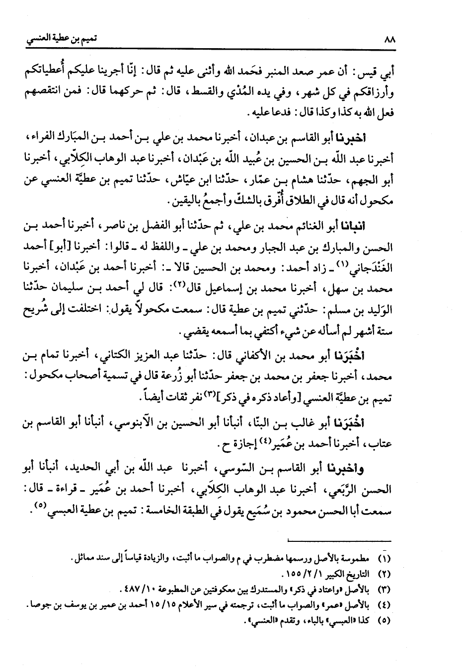 أبي قيس أن عمر صعد المنبر فحمد الله وأثنى عليه ثم قال إنا أجرينا عليكم أعطياتكم وأرزاقكم في كل شهر وفي يده المدي والقسط قال ثم حركهما قال فمن انتقصهم فعل الله به كذا وكذا فدعا عليه أخبرنا أبو القاسم بن عبدان أخبرنا محمد بن علي بن أحمد بن المبارك الفراء أخبرنا عبد الله بن الحسين بن عبيد الله بن عبدان أخبرنا عبد الوهاب الكلابي أخبرنا أبو الجهم حدثنا هشام بن عمار حدثنا ابن عياش حدثنا تميم بن عطية العنسي عن مكحول أنه قال في الطلاق أفرق بالشك وأجمع باليقين أنبأنا أبو الغنائم محمد بن علي ثم حدثنا أبو الفضل بن ناصر أخبرنا أحمد بن الحسن والمبارك بن عبد الجبار ومحمد بن علي واللفظ له قالوا أخبرنا أبو أحمد الغندجاني (1) زاد أحمد ومحمد بن الحسين قالا أخبرنا أحمد بن عبدان أخبرنا محمد بن سهل أخبرنا محمد بن إسماعيل قال قال لي أحمد بن سليمان حدثنا الوليد بن مسلم حدثني تميم بن عطية قال سمعت مكحولا يقول اختلفت إلى شريح ستة أشهر لم أسأله عن شئ أكتفي بما أسمعه يقضي أخبرنا أبو محمد بن الأكفاني قال حدثنا عبد العزيز الكتاني أخبرنا تمام بن محمد أخبرنا جعفر بن محمد بن جعفر حدثنا أبو زرعة قال في تسمية أصحاب مكحول تميم بن عطية العنسي وأعاد ذكره في ذكر (3) نفر ثقات أيضا أخبرنا أبو غالب بن البنا أنبأنا أبو الحسين بن الأبنوسي أنبأنا أبو القاسم بن عتاب أخبرنا أحمد بن عمير (4) إجازة ح وأخبرنا أبو القاسم بن السوسي أخبرنا عبد الله بن أبي الحديد أنبأنا أبو الحسن الربعي أخبرنا عبد الوهاب الكلابي أخبرنا أحمد بن عمير قراءة قال سمعت أبا الحسن محمود بن سميع يقول في الطبقة الخامسة تميم بن عطية العبسي