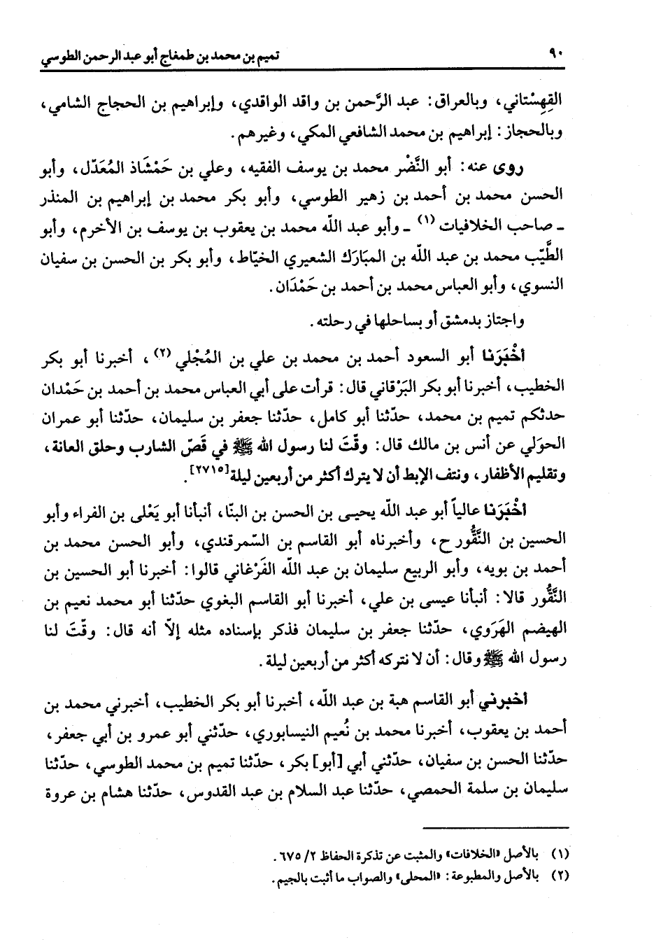 القهستاني وبالعراق عبد الرحمن بن واقد الواقدي وإبراهيم بن الحجاج الشامي وبالحجاز إبراهيم بن محمد الشافعي المكي وغيرهم روى عنه أبو النضر محمد بن يوسف الفقيه وعلي بن حمشاذ المعدل وأبو الحسن محمد بن أحمد بن زهير الطوسي وأبو بكر محمد بن إبراهيم بن المنذر صاحب الخلافيات (1) وأبو عبد الله محمد بن يعقوب بن يوسف بن الأخرم وأبو الطيب محمد بن عبد الله بن المبارك الشعيري الخياط وأبو بكر بن الحسن بن سفيان النسوي وأبو العباس محمد بن أحمد في بن حمدان واجتاز بدمشق أو بساحلها رحلته أخبرنا أبو السعود أحمد بن محمد بن علي بن المجلي (2) أخبرنا أبو بكر الخطيب أخبرنا أبو بكر البرقاني قال قرأت على أبي العباس محمد بن أحمد بن حمدان حدثكم تميم بن محمد حدثنا أبو كامل حدثنا جعفر بن سليمان حدثنا أبو عمران الحولي عن أنس بن مالك قال وقت لنا رسول الله (صلى الله عليه وسلم) في قص الشارب وحلق العانة وتقليم الأظفار ونتف الإبط أن لا يترك أكثر من أربعين ليلة