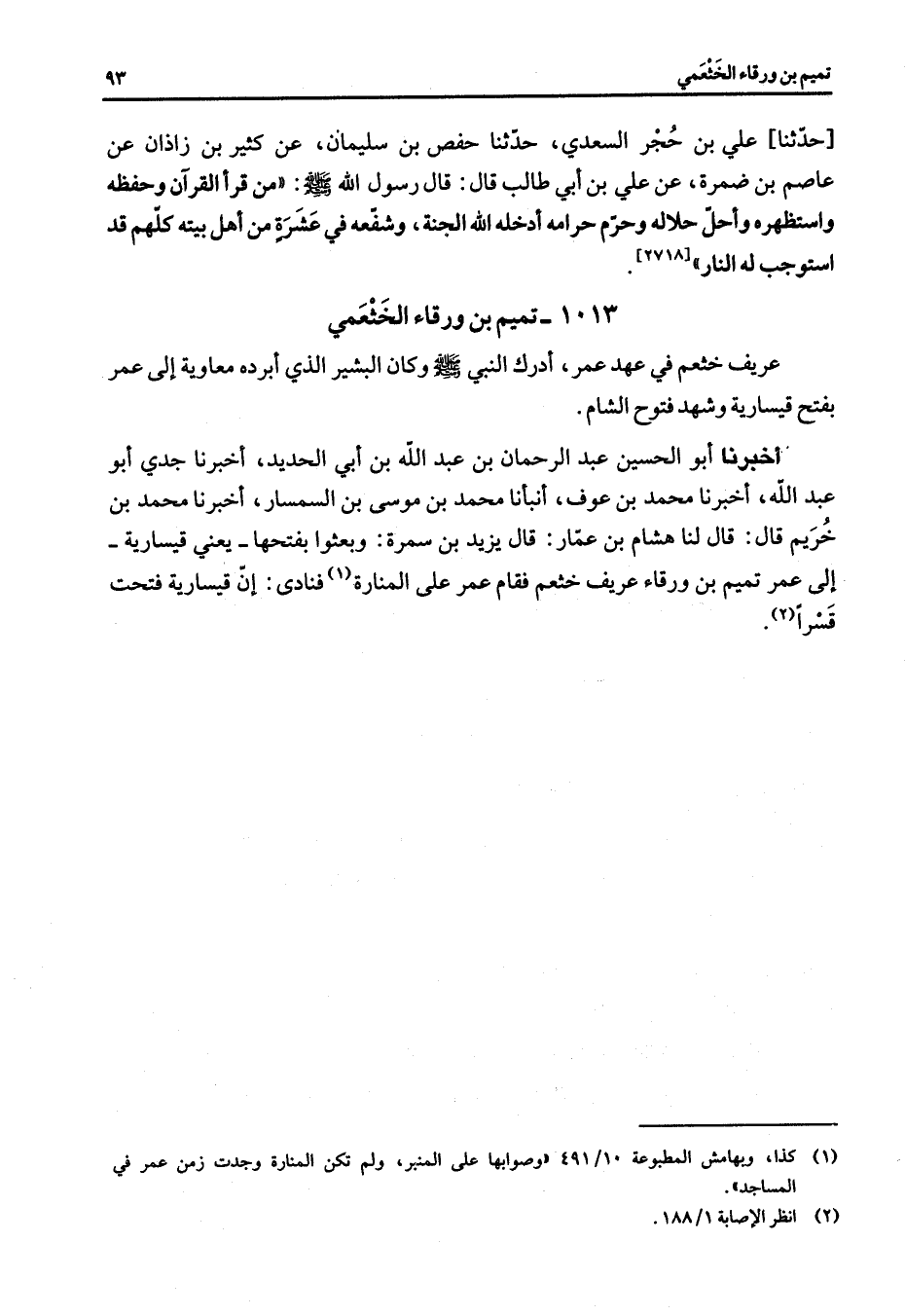 1013 - تميم بن ورقاء الخثعمي عريف خثعم في عهد عمر أدرك النبي (صلى الله عليه وسلم) وكان البشير الذي أبرده معاوية إلى عمر بفتح قيسارية وشهد فتوح الشام أخبرنا أبو الحسين عبد الرحمان بن عبد الله بن أبي الحديد أخبرنا جدي أبو عبد الله أخبرنا محمد بن عوف أنبأنا محمد بن موسى السمسار أخبرنا محمد بن خريم قال قال لنا هشام بن عمار قال يزيد بن سمرة وبعثوا بفتحها يعني قيسارية إلى عمر تميم بن ورقاء عريف خثعم فقام عمر على المنارة فنادى إن قيسارية فتحت قسرا (2)