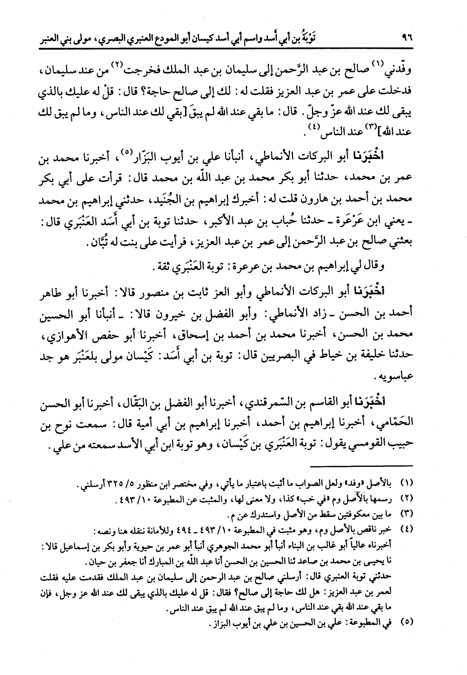 وفدني (1) صالح بن عبد الرحمن إلى سليمان بن عبد الملك فخرجت (2) من عند سليمان فدخلت على عمر بن عبد العزيز فقلت له لك إلى صالح حاجة قال قل له عليك بالذي يبقى لك عند الله عز وجل قال ما بقي عند الله لم يبق لك عند الله (3) عند الناس (4) اخبرنا أبو البركات الأنماطي أنبأنا علي بن أيوب البزاز (5) أخبرنا محمد بن عمربن محمد حدثنا أبو بكر محمد بن عبد الله بن محمد قال قرأت على أبي بكر محمد بن أحمد بن هارون قلت له أخبرك إبراهيم بن الجنيد حدثني إبراهيم بن محمد يعني ابن عرعرة حدثنا حباب بن عبد الأكبر حدثنا توبة بن أبي أسد العنبري قال بعثني صالح بن عبد الرحمن إلى عمر بن عبد العزيز فرأيت على بنت له تبان وقال لي إبراهيم بن محمد بن عرعرة توبة العنبري ثقة أخبرنا أبو البركات الأنماطي وأبو العز ثابت بن منصور قالا أخبرنا أبو طاهر أحمد بن الحسن زاد الأنماطي وأبو الفضل بن خيرون قالا أنبأنا أبو الحسين محمد بن الحسن أخبرنا محمد بن أحمد بن إسحاق أخبرنا أبو حفص الأهوازي حدثنا خليفة بن خياط في البصريين قال توبة بن أبي أسد كيسان مولى بلعنبر هو جد عباسويه أخبرنا أبو القاسم بن السمرقندي أخبرنا أبو الفضل بن البقال أخبرنا أبو الحسن الحمامي أخبرنا إبراهيم بن أحمد أخبرنا إبراهيم بن أبي أمية قال سمعت نوح بن حبيب القومسي يقول توبة العنبري بن كيسان وهو توبة ابن أبي الأسد سمعته من علي
