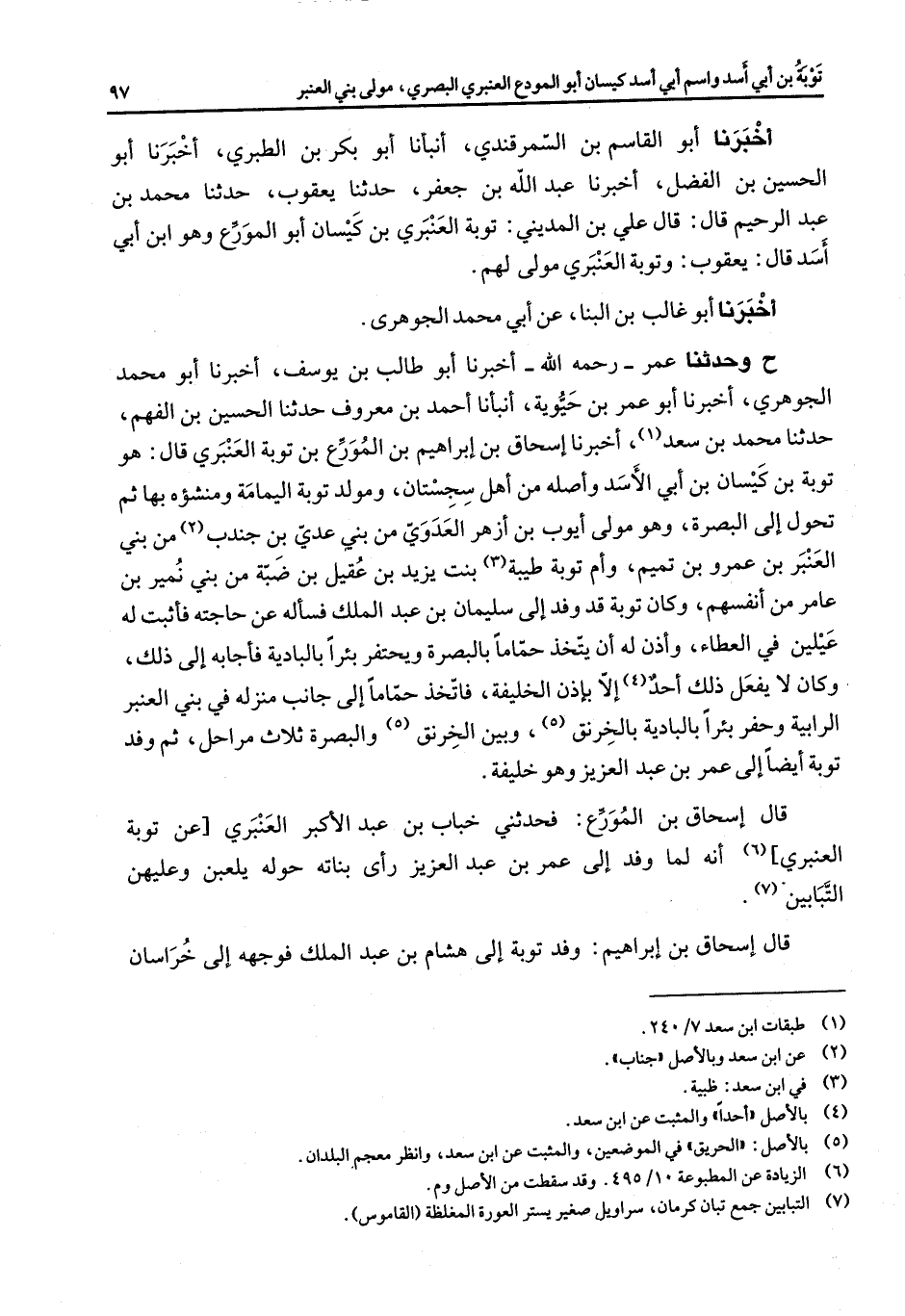 أخبرنا أبو القاسم بن السمرقندي أنبأنا أبو بكر بن الطبري أخبرنا أبو الحسين بن الفضل أخبرنا عبد الله بن جعفر حدثنا يعقوب حدثنا محمد بن عبد الرحيم قال قال علي بن المديني توبة العنبري بن كيسان أبو المورع وهو ابن أبي أسد قال يعقوب وتوبة العنبري مولى لهم أخبرنا أبو غالب بن البنا عن أبي محمد الجوهري ح وحدثنا عمر رحمه الله أخبرنا أبو طالب بن يوسف أخبرنا أبو محمد الجوهري أخبرنا أبو عمر بن حيوية أنبأنا أحمد بن معروف حدثنا الحسين بن الفهم حدثنا محمد بن سعد (1) أخبرنا إسحاق بن إبراهيم بن المورع بن توبة العنبري قال هو توبة بن كيسان بن أبي الأسد وأصله من أهل سجستان ومولد توبة اليمامة ومنشؤه بها ثم تحول إلى البصرة وهو مولى أيوب بن أزهر العدوي من بني عدي بن جندب (2) من بني العنبر بن عمرو بن تميم وأم توبة طيبة (3) بنت يزيد بن عقيل بن ضبة من بني نمير بن عامر من أنفسهم وكان توبة قد وفد إلى سليمان بن عبد الملك فسأله عحاجته فأثبت له عيلين في العطاء وأذن له أن يتخذ حماما بالبصرة ويحتفر بئرا بالبادية فأجابه إلى ذلك وكان لا يفعل ذلك أحد (4) إلا بإذن الخليفة فاتخذ حماما إلى جانب منزله في بني العنبر الرابية وحفر بئرا بالبادية بالخرنق (5) وبين الخرنق (5) والبصرة ثلاث مراحل ثم وفد توبة أيضا إلى عمر بن عبد العزيز وهو خليفة قا إسحاق بن المورع فحدثني خباب بن عبد الأكبر العنبري عن توبة العنبري (6) أنه لما وفد إلى عمر بن عبد العزيز رأى بناته حوله يلعبن وعليهن التبابين (7) قال إسحاق بن إبراهيم وفد توبة إلى هشام بن عبد الملك فوجهه إلى خراسان