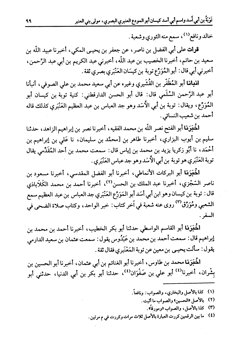 خالد ونافع (1) سمع منه الثوري وشعبة قرأت على أبي الفضل بن ناصر عن جعفر بن يحيى المكي أخبرنا عبيد الله بن سعيد بن حاتم أخبرنا الخصيب بن عبد الله أخبرني عبد الكريم بن أبي عبد الرحمن أخبرني أبي قال أبو المورع توبة بن كيسان العنبري بصري ثقة أنبأنا أبو المظفر بن القشيري وغيره عن أبي سعيد محمد بن علي الصوفي أنبأنا أبو عبد الرحمن السلمي قال قال أبو الحسن الدارقطني كنية توبة بن كيسان أبو المورع ويقال توبة بن أبي الأسد وهو جد العباس بن عبد العظيم العنبري كذلك قاله أحمد بن شعيب النسائي أخبرنا أبو الفتح نصر الله بن محمد الفقيه أخبرنا نصر بن إبراهيم الزاهد حدثنا سليم بن أيوب البزاري أخبرنا طاهر بن محمد بن سليمان نا علي بن إبراهيم بن أحمد نا أبو زكريا يزيد بن محمد بن إياس قال سمعت محمد بن أحمد المقدمي يقال توبة العنبري هو توبة بن أبي الأسد وهو جد عباس العنبري أخبرنا أبو البركات الأنماطي أخبرنا أبو الفضل المقدسي أخبرنا مسعود بن ناصر السجزي أخبرنا عبد الملك بن الحسن (2) أخبرنا أحمد بن محمد الكلاباذي قال توبة بن كيسان وهو ابن أبي أسد أبو المورع العنبري جد العباس بن عبد العظيم سمع الشعبي ومورق (3) روى عنه شعبة في آخر كتاب خبر الواحد وكتاب صلاة الضحى في السفر أخبرنا أبو القاسم الواسطي حدثنا أبو بكر الخطيب أخبرنا أحمد بن محمد بن إبراهيم قال سمعت أحمد بن محمد بن عبدوس يقول سمعت عثمان بن سعيد الدارمي يقول سألت يحيى بن معين عن توبة المعنبري فقال ثقة أخبرنا محمد بن طاوس أخبرنا أبو الغنائم بن أبي عثمان أخبرنا أبو الحسين بن بشران أخبرنا (4) أبو علي بن صفوان (4) حدثنا أبو بكر بن أبي الدنيا حدثني أبو