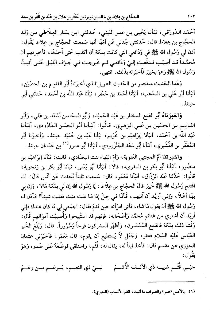أحمد الدورقي نبأنا يحيى بن عمر الليثي حدثني ابن يسار العلاطي من ولد الحجاج بن علاط قال حدثتني جدتي عن أمها أنها سمعت الحجا بن علاط يقول أذن لي رسول الله (صلى الله عليه وسلم) في ودائعي التي كانت بمكة أن أكذب حتى آخذها فأخبرتهم أن محمدا قد أصيب فدفعت إلي ودائعي ثم خرجت في جوف الليل حتى أتيت رسول الله (صلى الله عليه وسلم) وهو بخيبر فأخبرته بذلك انتهى وهذا الحديث مختصر من الحديث الطويل الذي أخبرناه أبو القاسم بن الحصين أنبانا أبو علي بن المذهب أنبأنا أحمد بن جعفر نبأنا عبد الله بن أحمد حدثني أبي حينئذ وأخبرناه أبو الفتح المختار بن عبد الحميد وأبو المحاسن أسعد بن علي وأبو القاسم بن الحسين بن علي الزهري قالوا أنبأنا أبو الحسن الداوودي أنبأنا عبد الله بن أحمد أنبأنا إبراهيم بن خريم نبأنا عبد بن حميد حينئذ وأخبرنا أبو المظفر بن القشيري أنبأنا أبو سعد الجنزرودي أنبأنا أبو عمرو (1) بن حمدان حينئذ وأخبرتنا أم المجتبى العلوية وأم البهاء بنت البغدادي قالت نبأنا إبراهيم بن منصور أنبأنا أبو بكر بن المقرئ قالا أنبانا أبو يعلى نبأنا أبو بكر بن زنجوية قالوا حدثنا عبد الرزاق أنبأنا معمر قال سمعت ثابتا يحدث عن أنس قال لما افتتح رسول الله (صلى الله عليه وسلم) خيبر قال الحجاج بن علاط يا رسول الله إن لي بمكة مالا وإن لي بها أهلا وإني أريد أن آتيهم فأنا في حل إذا ما نلت منك فقلت شيئا فأذن له رسول الله (صلى الله عليه وسلم) أن يقول ما شاء فأتى امرأته حين قدم فقال اجمعي لي ما كان عندك فإني أريد أن أشتري من غنائم محمد وأصحابه فإنهم قد استبيحوا وأصيبت أموالهم قال وفشا ذلك بمكة فانقمع المسلمون وأظهر المشركون فرحا وسرورا قال وبلغ الخبر العباس عليه السلام فعقر وجعل لا يستطيع أن يقوم قال معمر فأخبرني عثمان الجزري عن مقسم قال فأخذ ابنا له يقال له قثم واستلقى فوضعه على صدره وهو يقول حبي قثم شبيه ذي الأنف الأشم * نبي ذي النعم يرغم من رغم