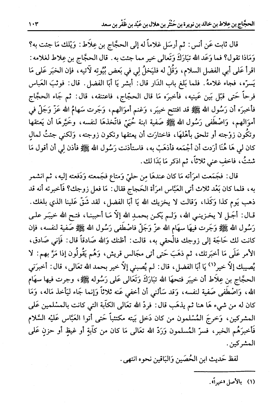 قال ثابت بن أنس ثم أرسل غلاما له إلى الحجاج بن علاط ويلك ما جئت به وماذا تقول فما وعد الله تبارك وتعالى خير مما جئت به قال الحجاج بن علاط لغلامه اقرأ على أبي الفضل السلام وقل له فليخل لي في بعض بيوته لآتيه فإن الخبر على ما يسره فجاء غلامه فلما بلغ باب الدار قال أبشر يا أبا الفضل قال فوثب العباس فرحا حتى قبل بين عينيه فأخبره ما قال الحجاج فاعتنقه قال ثم جاء الحجاج فأخبره أن رسول الله (صلى الله عليه وسلم) قد افتتح خيبر وغنم أموالهم وجرت سهام الله عز وجل في أموالهم واصطفى رسول الله (صلى الله عليه وسلم) صفية ابنة حيي فاتخذها لنفسه وخيرها أن يعتقها وتكون زوجته أو تلحق بأهلها فاختارت أن يعتقها وتكون زوجته ولكني جئت لمال كان لي ها هنا أردت أن أجمعه فأذهب به فاستأذنت رسول الله (صلى الله عليه وسلم) فأذن لي أن أقول ما شئت فاخف عني ثلاثا ثم اذكر ما بدا لك قال فجمعت امرأته ما كان عندها من حلي ومتاع فجمعته ودفعته إليه ثم انشمر به فلما كان بعد ثلاث أتى العباس امرأة الحجاج فقال ما فعل زوجك فأخبرته أنه قد ذهب يوم كذا وكذا وقالت لا يخزيك الله يا أبا الفضل لقد شق علينا الذي بلغك قال أجل لا يخزيني الله ولم يكن بحمد الله إلا ما أحببنا فتح الله خيبر على رسول الله (صلى الله عليه وسلم) وجرت فيها سهام الله عز وجل فاصطفى رسول الله (صلى الله عليه وسلم) صفية لنفسه فإن كانت لك حاجة إلى زوجك فالحقي به قالت أظنك والله صادقا قال فإني صادق الأمر على ما أخبرتك ثم ذهب حتى أتى مجالس قريش وهم يقولون إذا مر بهم لا يصيبك إلا خير (1) يا أبا الفضل قال لم يصبني إلا خير بحمد الله تعالى قال أخبرني الحجاج بن علاط أن خيبر فتحها الله تبارك وتعالى على رسوله (صلى الله عليه وسلم) وجرت فيها سهام الله واصطفى صفية لنفسه وقد سألني أن أخفي عنه ثلاثا وإنما جاء ليأخذ ماله وما كان له من شئ ها هنا ثم يذهب قال فرد الله تعالى الكآبة التي كانت بالمسلمين على المشركين وخرج المسلمون من كان دخل بيته مكتئبا حتى أتوا العباس عليه السلام فأخبرهم الخبر فسر المسلمون ورد الله تعالى ما كان من كآبة أو غيظ أو حزن على المشركين لفظ حديث ابن الحصين والباقين نحوه انتهى