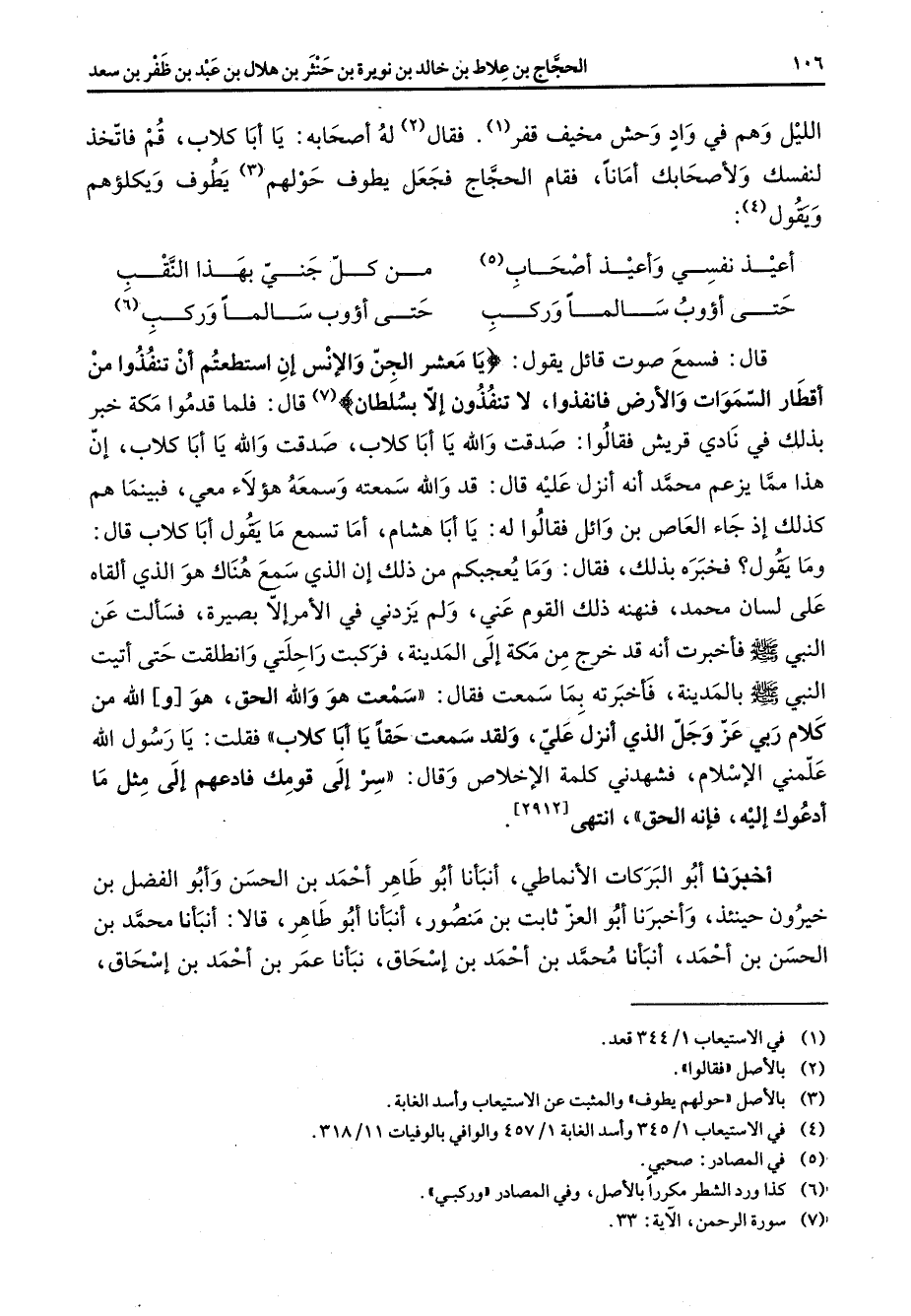 الليل وهم في واد وحش مخيف قفر (1) فقال (2) له أصحابه يا أبا كلاب قم فاتخذ لنفسك ولأصحابك أمانا فقام الحجاج فجعل يطوف حولهم (3) يطوف ويكلؤهم ويقول (4) أعيذ نفسي وأعيذ أصحاب (5) * من كل جني بهذا النقب حتى أؤوب سالما وركب * حتى أؤوب سالما وركب (6) قال فسمع صوت قائل يقول " يا معشر الجن والإنس إن استطعتم أن تنفذوا من