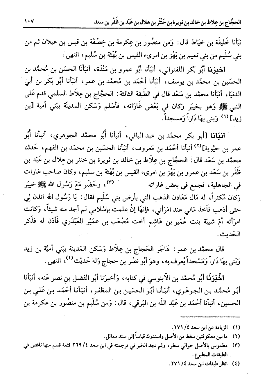 نبأنا خليفة بن خياط قال ومن منصور بن عكرمة بن خصفة بن قيس بن عيلان ثم من بني سليم من بني تميم بن بهز بن امرئ القيس بن بهثة بن سليم انتهى أخبرنا أبو بكر اللفتواني أنبأنا أبو عمرو بن مندة أنبأنا الحسن بن محمد بن الحسين بن محمد بن يوسف أنبأنا أحمد بن محمد بن عمر أنبأنا أبو بكر بن أبي الدنيا أنبأنا محمد بن سعد قال في الطبقة الثالثة الحجاج بن علاط السلمي قدم على النبي (صلى الله عليه وسلم) وهو بخيبر وكان في بعض غاراته فأسلم وسكن المدينة ببني أمية بن زيد (1) وبنى بها دارا ومسجدا أنبأنا أبو بكر محمد بن عبد الباقي أنبأنا أبو محمد الجوهري أنبأنا أبو عمر بن حيوية (2) أنبأنا أحمد بن معروف أنبأنا الحسين بن محمد بن الفهم حدثنا محمد بن سعد قال الحجاج بن علاط بن خالد بن ثويرة بن خنثر بن هلال بن عبد بن ظفر بن سعد بن عمرو بن بهز بن امرئ القيس بن بهثة بن سليم وكان صاحب غارات في الجاهلية فجمع في بعض غاراته (3) وحضر مع رسول الله (صلى الله عليه وسلم) خيبر وكان مكثرا له مال معادن الذهب التي بأرض بني سليم فقال يا رسول الله ائذن لي حتى أذهب فآخذ مالي عند امرأتي فإنها إن علمت بإسلامي لم أجد منه شيئا وكانت امرأته أم شيبة بنت عمير بن هاشم أخت مصعب بن عمير العبدري فأذن له فذكر الحديث قال محمد بن عمر هاجر الحجاج بن علاط وسكن المدينة ببني أمية بن زيد وبنى بها دارا ومسجدا يعرف به وهو أبو نصر بن حجاج وله حديث (4) انتهى أخبرنا أبو محمد بن الآبنوسي في كتابه وأخبرنا أبو الفضل بن نصر عنه أنبأنا أبو محمد بن الجوهري أنبأنا أبو الحسين بن المظفر أنبأنا أحمد بن علي بن الحسين أنبأنا أحمد بن عبد الله بن البرقي قال ومن سليم بن منصور بن عكرمة بن