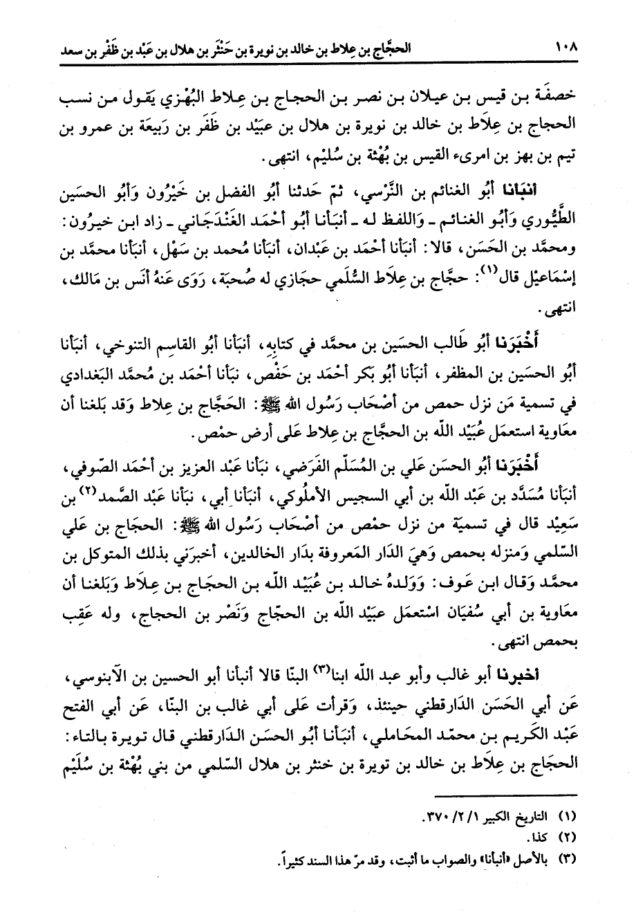 خصفة بن قيس بن عيلان بن نصر بن الحجاج بن علاط البهزي يقول من نسب الحجاج بن علاط بن خالد بن نويرة بن هلال بن عبيد بن ظفر بن ربيعة بن عمرو بن تيم بن بهز بن امرئ القيس بن بهثة بن سليم انتهى أنبأنا أبو الغنائم بن النرسي ثم حدثنا أبو الفضل بن خيرون وأبو الحسين الطيوري وأبو الغنائم واللفظ له أنبأنا أبو أحمد الغندجاني زاد ابن خيرون ومحمد بن الحسن قالا أنبأنا أحمد بن عبدان أنبأنا محمد بن سهل أنبأنا محمد بن إسماعيل قال (1) حجاج بن علاط السلمي حجازي له صحبة روى عنه أنس بن مالك انتهى أخبرنا أبو طالب الحسين بن محمد في كتابه أنبأنا أبو القاسم التنوخي أنبأنا أبو الحسين بن المظفر أنبأنا أبو بكر أحمد بن حفص نبأنا أحمد بن محمد البغدادي في تسمية من نزل حمص من أصحاب رسول الله (صلى الله عليه وسلم) الحجاج بن علاط وقد بلغنا أن معاوية استعمل عبيد الله بن الحجاج بن علاط على أرض حمص أخبرنا أبو الحسن علي بن المسلم الفرضي نبأنا عبد العزيز بن أحمد الصوفي أنبأنا مسدد بن عبد الله بن أبي السجيس الأملوكي أنبأنا أبي نبأنا عبد الصمد (2) بن سعيد قال في تسمية من نزل حمص من أصحاب رسول الله (صلى الله عليه وسلم) الحجاج بن علي السلمي ومنزله بحمص وهي الدار المعروفة بدار الخالدين أخبرني بذلك المتوكل بن محمد وقال ابن عوف وولده خالد بن عبيد الله بن الحجاج بن علاط وبلغنا أن معاوية بن أبي سفيان استعمل عبيد الله بن الحجاج ونصر بن الحجاج وله عقب بحمص انتهى أخبرنا أبو غالب وأبو عبد الله ابنا (3) البنا قالا أنبأنا أبو الحسين بن الآبنوسي عن أبي الحسن الدارقطني حينئذ وقرأت على أبي غالب بن البنا عن أبي الفتح عبد الكريم بن محمد المحاملي أنبأنا أبو الحسن الدارقطني قال تويرة بالتاء الحجاج بن علاط بن خالد بن تويرة بن خنثر بن هلال السلمي من بني بهثة بن سليم
