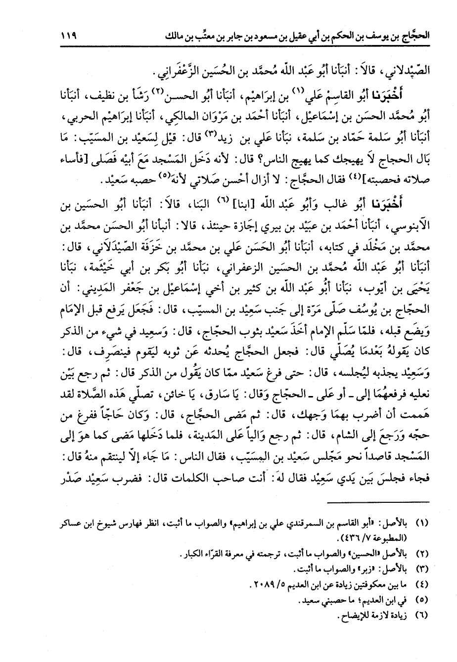 الصيدلاني قالا أنبأنا أبو عبد الله محمد بن الحسين الزعفراني أخبرنا أبو القاسم علي (1) بن إبراهيم أنبأنا أبو الحسن (2) رشأ بن نظيف أنبأنا أبو محمد الحسن بن إسماعيل أنبأنا أحمد بن مروان المالكي أنبأنا إبراهيم الحربي أنبأنا أبو سلمة حماد بن سلمة نبأنا علي بن زيد (3) قال قيل لسعيد بن المسيب ما بال الحجاج لا يهيجك كما يهيج الناس قال لأنه دخل المسجد مع أبيه فصلى فأساء صلاته فحصبته (4) فقال الحجاج لا أزال أحسن صلاتي لأنه (5) حصبه سعيد أخبرنا أبو غالب وأبو عبد الله ابنا (6) البنا قالا أنبأنا أبو الحسين بن الآبنوسي أنبأنا أحمد بن عبيد بن بيري إجازة حينئذ قالا أنبأنا أبو الحسن محمد بن محمد بن مخلد في كتابه أنبأنا أبو الحسن علي بن محمد بن خزفة الصيدلاني قال أنبأنا أبو عبد الله محمد بن الحسين الزعفراني نبأنا أبو بكر بن أبي خيثمة أنبأنا يحيى بن أيوب نبأنا أبو عبد الله بن كثير بن أخي إسماعيل بن جعفر المديني أن الحجاج بن يوسف صلى مرة إلى جنب سعيد بن المسيب قال فجعل يرفع قبل الإمام ويضع قبله فلما سلم الإمام أخذ سعيد بثوب الحجاج قال وسعيد في شئ من الذكر كان يقوله بعدما يصلي قال فجعل الحجاج يحدثه عن ثوبه ليقوم فينصرف قال وسعيد يجذبه ليجلسه قال حتى فرغ سعيد مما كان يقول من الذكر قال ثم رجع بين نعليه فرفعهما إلى أو على الحجاج وقال يا سارق يا خائن تصلي هذه الصلاة لقد هممت أن أضرب بهما وجهك قال ثم مضى الحجاج قال وكان حاجا ففرغ من حجه ورجع إلى الشام قال ثم رجع واليا على المدينة فلما دخلها مضى كما هو إلى المسجد قاصدا نحو مجلس سعيد بن المسيب فقال الناس ما جاء إلا لينتقم منه قال فجاء فجلس بين يدي سعيد فقال له أنت صاحب الكلمات قال فضرب سعيد صدر