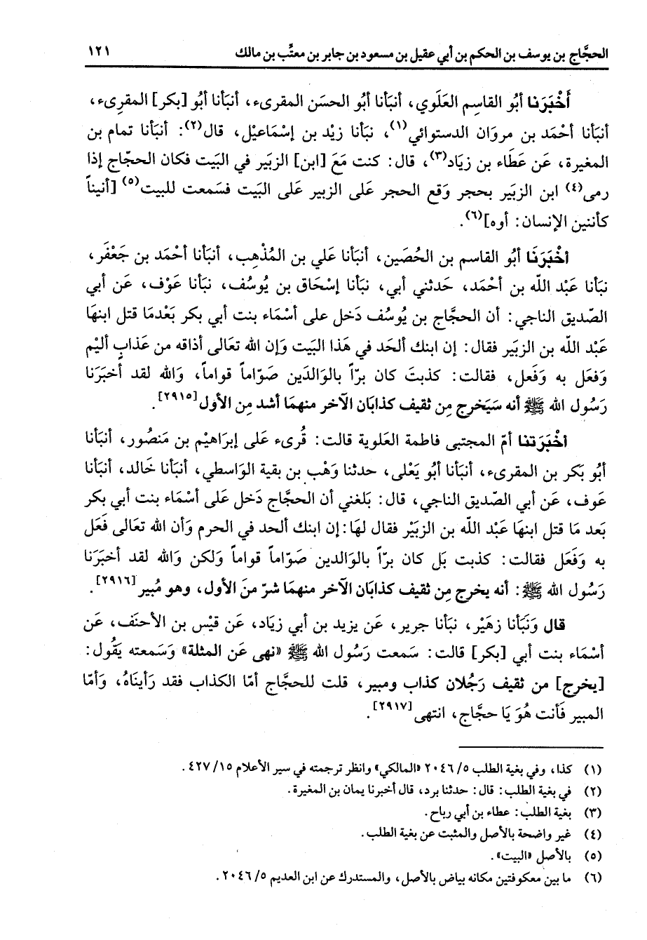 أخبرنا أبو القاسم العلوي أنبأنا أبو الحسن المقرئ أنبأنا أبو بكر المقرئ أنبأنا أحمد بن مروان الدستوائي (1) نبأنا زيد بن إسماعيل قال (2) أنبأنا تمام بن المغيرة عن عطاء بن زياد (3) قال كنت مع ابن الزبير في البيت فكان الحجاج إذا رمى (4) ابن الزبير بحجر وقع الحجر على الزبير على البيت فسمعت للبيت (5) أنينا كأنين الإنسان أوه (6) أخبرنا أبو القاسم بن الحصين أنبأنا علي بن المذهب أنبأنا أحمد بن جعفر نبأنا عبد الله بن أحمد حدثني أبي نبأنا إسحاق بن يوسف نبأنا عوف عن أبي الصديق الناجي أن الحجاج بن يوسف دخل على أسماء بنت أبي بكر بعدما قتل ابنها عبد الله بن الزبير فقال إن ابنك ألحد في هذا البيت وإن الله تعالى أذاقه من عذاب أليم وفعل به وفعل فقالت كذبت كان برا بالوالدين صواما قواما والله لقد أخبرنا رسول الله (صلى الله عليه وسلم) أنه سيخرج من ثقيف كذابان الآخر منهما أشد من الأول أخبرتنا أم المجتبى فاطمة العلوية قالت قرئ على إبراهيم بن منصور أنبأنا أبو بكر بن المقرئ أنبأنا أبو يعلى حدثنا وهب بن بقية الواسطي أنبأنا خالد أنبأنا عوف عن أبي الصديق الناجي قال بلغني أن الحجاج دخل على أسماء بنت أبي بكر بعد ما قتل ابنها عبد الله بن الزبير فقال لها إن ابنك ألحد في الحرم وأن الله تعالى فعل به وفعل فقالت كذبت بل كان برا بالوالدين صواما قواما ولكن والله لقد أخبرنا رسول الله (صلى الله عليه وسلم) أنه يخرج من ثقيف كذابان الآخر منهما شر من الأول وهو مبير قال ونبأنا زهير نبأنا جرير عن يزيد بن أبي زياد عن قيس بن الأحنف عن أسماء بنت أبي بكر قالت سمعت رسول الله (صلى الله عليه وسلم) نهى عن المثلة وسمعته يقول يخرج من ثقيف رجلان كذاب ومبير قلت للحجاج أما الكذاب فقد رأيناه وأما المبير فأنت هو يا حجاج انتهى