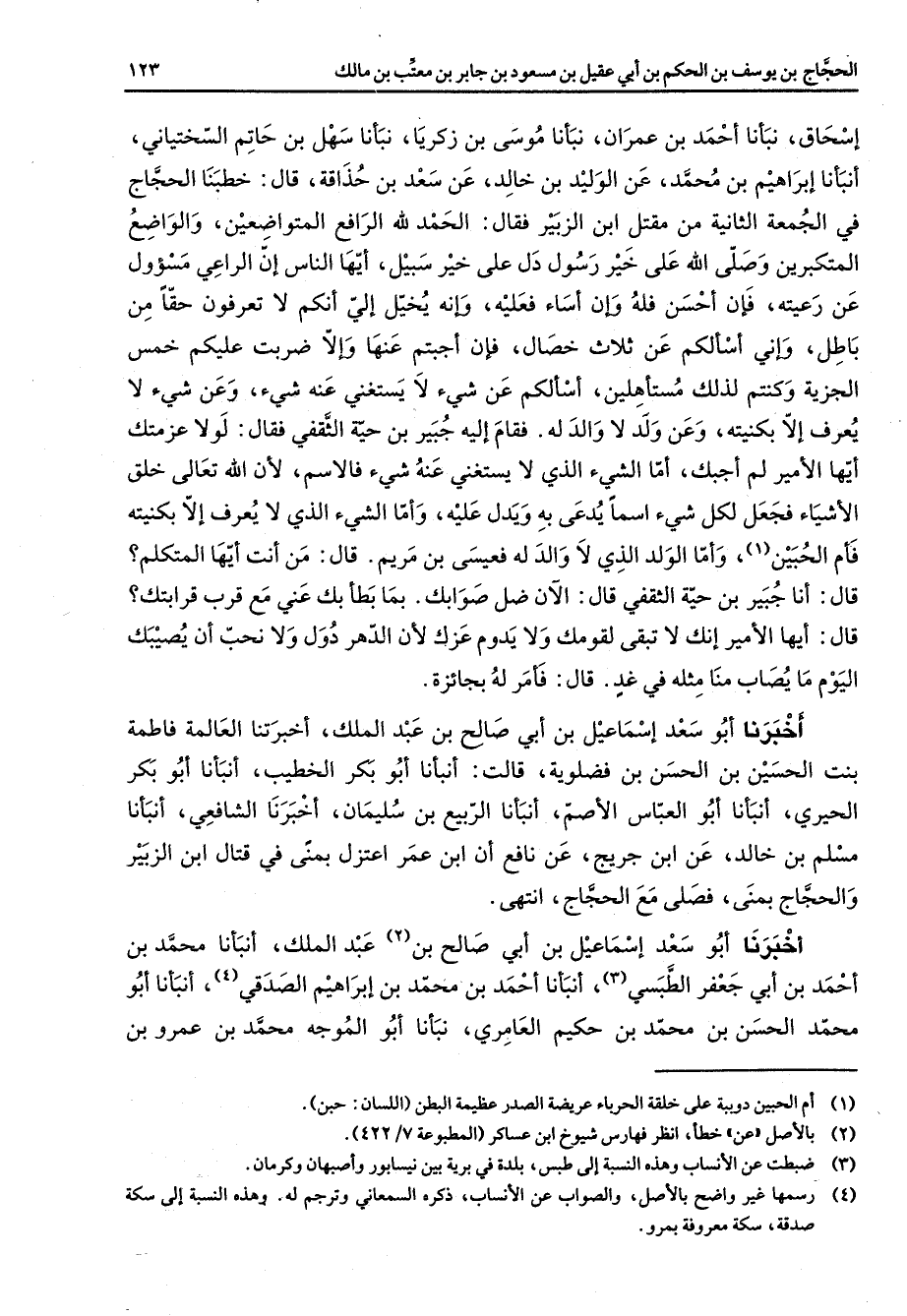 إسحاق نبأنا أحمد بن عمران نبأنا موسى بن زكريا نبأنا سهل بن حاتم السختياني أنبأنا إبراهيم بن محمد عن الوليد بن خالد عن سعد بن حذاقة قال خطبنا الحجاج في الجمعة الثانية من مقتل ابن الزبير فقال الحمد لله الرافع المتواضعين والواضع المتكبرين و (صلى الله عليه وسلم) على خير رسول دل على خير سبيل أيها الناس إن الراعي مسؤول عن رعيته فإن أحسن فله وإن أساء فعليه وإنه يخيل إلي أنكم لا تعرفون حقا من باطل وإني أسألكم عن ثلاث خصال فإن أجبتم عنها وإلا ضربت عليكم خمس الجزية وكنتم لذلك مستأهلين أسألكم عن شئ لا يستغني عنه شئ وعن شئ لا يعرف إلا بكنيته وعن ولد لا والد له فقام إليه جبير بن حية الثقفي فقال لولا عزمتك أيها الأمير لم أجبك أما الشئ الذي لا يستغني عنه شئ فالاسم لأن الله تعالى خلق الأشياء فجعل لكل شئ اسما يدعى به ويدل عليه وأما الشئ الذي لا يعرف إلا بكنيته فأم الحبين (1) وأما الولد الذي لا والد له فعيسى بن مريم قال من أنت أيها المتكلم قال أنا جبير بن حية الثقفي قال الآن ضل صوابك بما بطأ بك عني مع قرب قرابتك قال أيها الأمير إنك لا تبقى لقومك ولا يدوم عزك لأن الدهر دول ولا نحب أن يصيبك اليوم ما يصاب منا مثله في غد قال فأمر له بجائزة أخبرنا أبو سعد إسماعيل بن أبي صالح بن عبد الملك أخبرتنا العالمة فاطمة بنت الحسين بن الحسن بن فضلوية قالت أنبأنا أبو بكر الخطيب أنبأنا أبو بكر الحيري أنبأنا أبو العباس الأصم أنبأنا الربيع بن سليمان أخبرنا الشافعي أنبأنا مسلم بن خالد عن ابن جريج عن نافع أن ابن عمر اعتزل بمنى في قتال ابن الزبير والحجاج بمنى فصلى مع الحجاج انتهى أخبرنا أبو سعد إسماعيل بن أبي صالح بن (2) عبد الملك أنبأنا محمد بن أحمد بن أبي جعفر الطبسي (3) أنبأنا أحمد بن محمد بن إبراهيم الصدقي (4) أنبأنا أبو محمد الحسن بن محمد بن حكيم العامري نبأنا أبو الموجه محمد بن عمرو بن