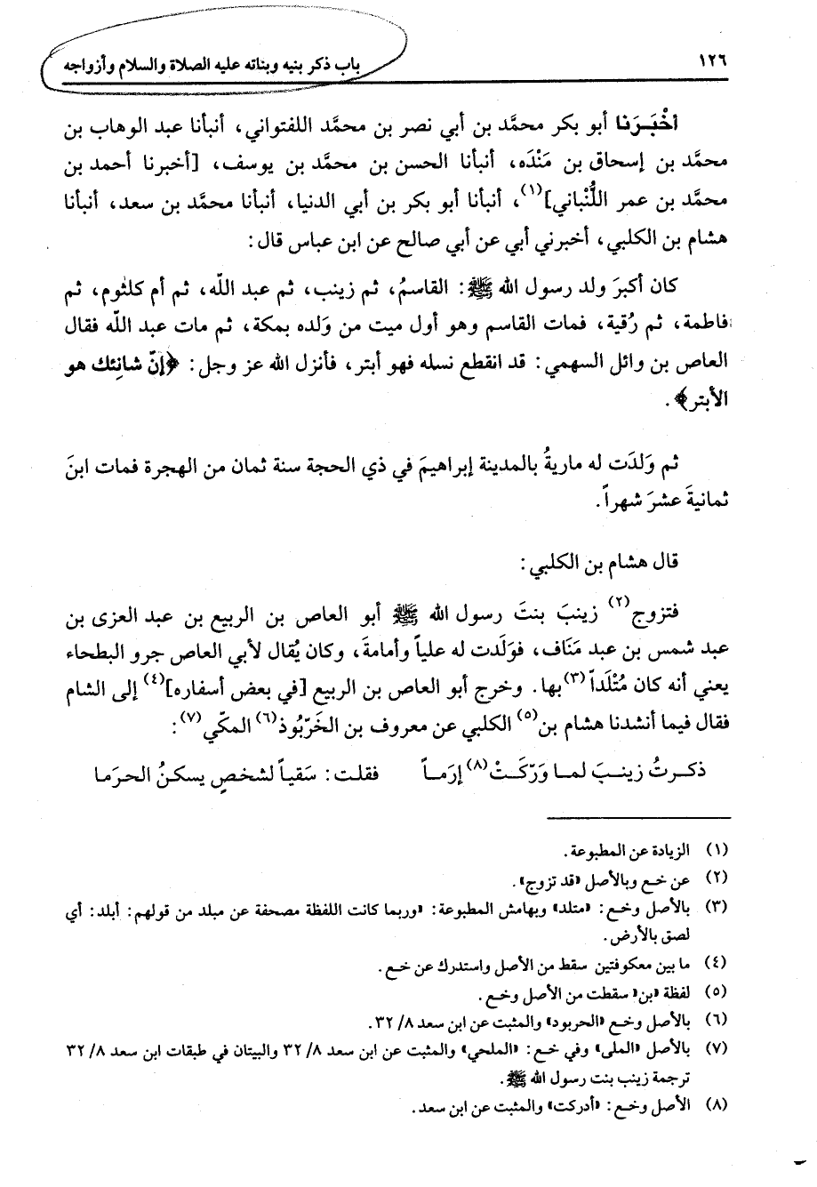 أخبرنا أبو بكر محمد بن أبي نصر بن محمد اللفتواني أنبأنا عبد الوهاب بن محمد بن إسحاق بن مندة أنبأنا الحسن بن محمد بن يوسف أخبرنا أحمد بن محمد بن عمر اللنباني (1) أنبأنا أبو بكر بن أبي الدنيا أنبأنا محمد بن سعد أنبأنا هشام بن الكلبي أخبرني أبي عن أبي صالح عن ابن عباس قال كان أكبر ولد رسول الله (صلى الله عليه وسلم) القاسم ثم زينب ثم عبد الله ثم أم كلثوم ثم فاطمة ثم رقية فمات القاسم وهو أول ميت من ولده بمكة ثم مات عبد الله فقال العاص بن وائل السهمي قد انقطع نسله فهو أبتر فأنزل الله عز وجل " إن شانئك هو الأبتر " ثم ولدت له مارية بالمدينة إبراهيم في ذي الحجة سنة ثمان من الهجرة فمات ابن ثمانية عشر شهرا قال هشام بن الكلبي فتزوج (2) زينب بنت رسول الله (صلى الله عليه وسلم) أبو العاص بن الربيع بن عبد العزى بن عبد شمس بن عبد مناف فولدت له عليا وأمامة وكان يقال لأبي العاص جرو البطحاء يعني انه كان متلدا (3) بها وخرج أبو العاص بن الربيع في بعض أسفاره (4) إلى الشام فقال فيما أنشدنا هشام بن (5) الكلبي عن معروف بن الخربوذ (6) المكي (7) ذكرت زينب لما وركت (8) إرما * فقلت سقيا يسكن الحرما