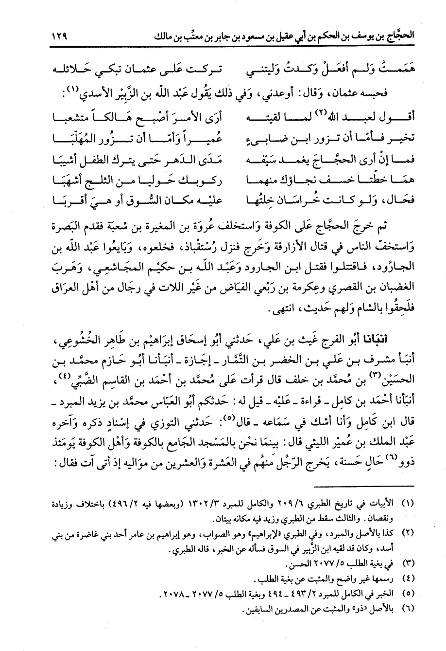 هممت لم أفعل وكدت وليتني * تركت على عثمان تبكي حلائله * فحبسه عثمان وقال أوعدني وفي ذلك يقول عبد الله بن الزبير الأسدي * (1) أقول لعبد الله (2) لما لقيته * أرى الأمر أصبح هالكا متشعبا تخير فأما أن تزور ابن ضابئ * عميرا وأما أن تزور المهلبا فما إن أرى الحجاج يغمد سيفه * مدى الدهر حتى يترك الطفل أشيبا هما خطتا خسف نجاؤك منهما * ركوبك حوليا من الثلج أشهبا فحال ولو كانت خراسان خلتها * عليه مكان السوق أو هي أقربا * ثم خرج الحجاج على الكوفة واستخلف عروة بن المغيرة بن شعبة فقدم البصرة واستخف الناس في قتال الأزارقة وخرج فنزل رستقباذ فخلعوه وبايعوا عبد الله بن الجارود فاقتتلوا فقتل ابن الجارود وعبد الله بن حكيم المجاشعي وهرب الغضبان بن القصري وعكرمة بن ربعي الفياض من غير اللات في رجال من أهل العراق فلحقوا بالشام ولهم حديث انتهى أنبأنا أبو الفرج غيث بن علي حدثني أبو إسحاق إبراهيم بن طاهر الخشوعي أنبأ مشرف بن علي بن الخضر بن التمار إجازة أنبأنا أبو حازم محمد بن الحسين (3) بن محمد بن خلف قال قرأت على محمد بن أحمد بن القاسم الضبي (4) أنبأنا أحمد بن كامل قراءة عليه قيل له حدثكم أبو العباس محمد بن يزيد المبرد قال ابن كامل وأنا أشك في سماعه قال (5) حدثني التوزي في إسناد ذكره وآخره عبد الملك بن عمير الليثي قال بينما نحن بالمسجد الجامع بالكوفة وأهل الكوفة يومئذ ذوو (6) حال حسنة يخرج الرجل منهم في العشرة والعشرين من مواليه إذ أتى آت فقال