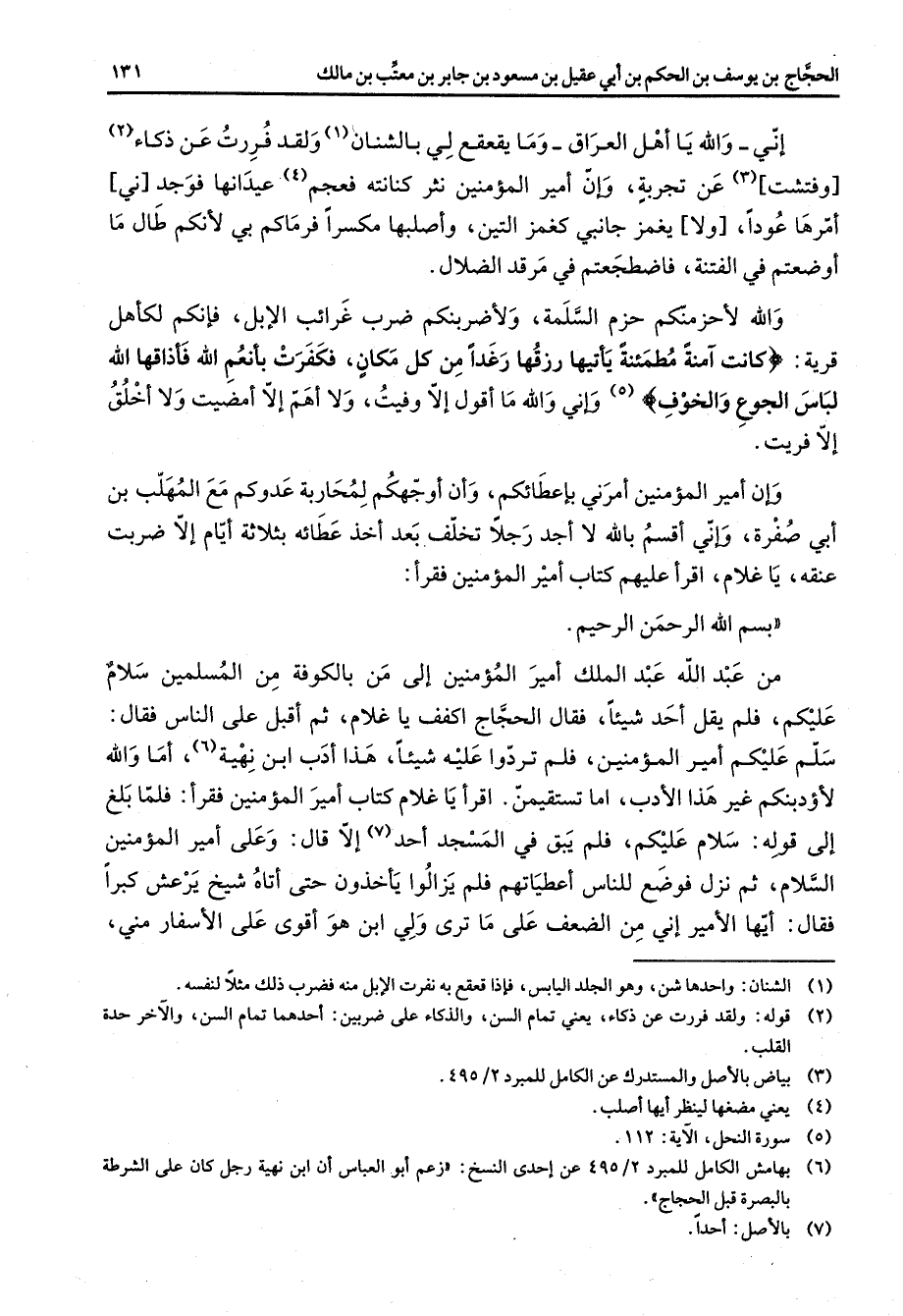 إني والله يا أهل العراق وما يقعقع لي بالشنان (1) ولقد فررت عن ذكاء (2) وفتشت (3) عن تجربة وإن أمير المؤمنين نثر كنانته فعجم (4) عيدانها فوجد ني أمرها عودا ولا يغمز جانبي كغمز التين وأصلبها مكسرا فرماكم بي لأنكم طال ما أوضعتم في الفتنة فاضطجعتم في مرقد الضلال والله لأحزمنكم حزم السلمة ولأضربنكم ضرب غرائب الإبل فإنكم لكأهل قرية " كانت آمنة مطمئنة يأتيها رزقها رغدا من كل مكان فكفرت بأنعم الله فأذاقها الله لباس الجوع والخوف " (5) وإني والله ما أقول إلا وفيت ولا أهم إلا أمضيت ولا أخلق إلا فريت وإن أمير المؤمنين أمرني بإعطائكم وأن أوجهكم لمحاربة عدوكم مع المهلب بن أبي صفرة وإني أقسم بالله لا أجد رجلا تخلف بعد أخذ عطائه بثلاثة أيام إلا ضربت عنقه يا غلام اقرأ عليهم كتاب أمير المؤمنين فقرأ بسم الله الرحمن الرحيم من عبد الله عبد الملك أمير المؤمنين إلى من بالكوفة من المسلمين سلام عليكم فلم يقل أحد شيئا فقال الحجاج اكفف يا غلام ثم أقبل على الناس فقال سلم عليكم أمير المؤمنين فلم تردوا عليه شيئا هذا أدب ابن نهية (6) أما والله لأؤدبنكم غير هذا الأدب أما تستقيمن اقرأ يا غلام كتاب أمير المؤمنين فقرأ فلما بلغ إلى قوله سلام عليكم فلم يبق في المسجد أحد (7) إلا قال وعلى أمير المؤمنين السلام ثم نزل فوضع للناس أعطياتهم فلم يزالوا يأخذون حتى أتاه شيخ يرعش كبرا فقال أيها الأمير إني من الضعف على ما ترى ولي ابن هو أقوى على الأسفار مني