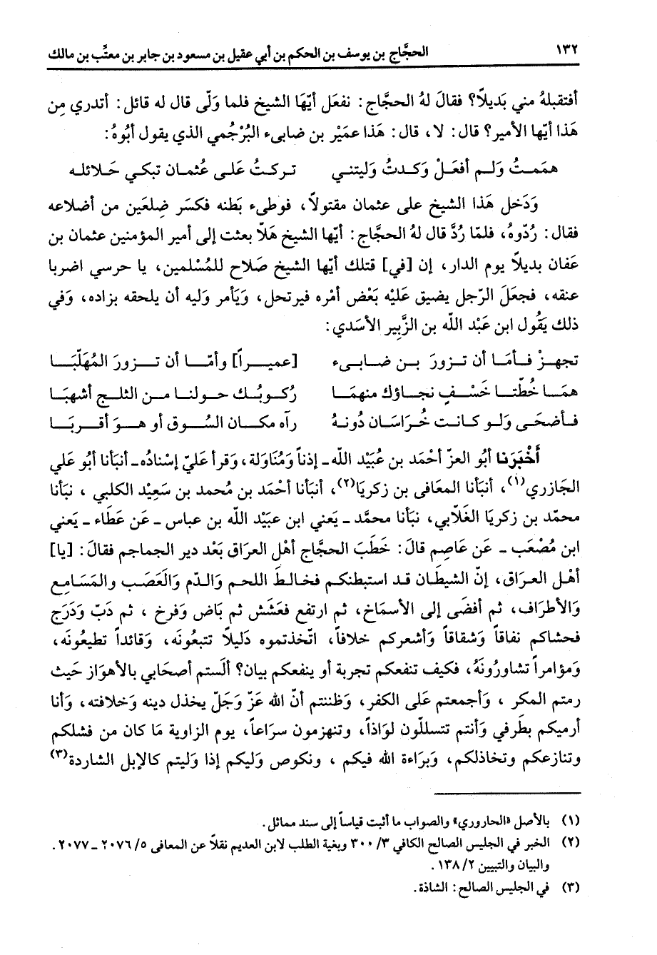 أفتقبله مني بديلا فقال له الحجاج نفعل أيها الشيخ فلما ولى قال له قائل أتدري من هذا أيها الأمير قال لا قال هذا عمير بن ضابئ البرجمي الذي يقول أبوه هممت ولم أفعل وكدت وليتني * تركت على عثمان تبكي حلائله * ودخل هذا الشيخ على عثمان مقتولا فوطئ بطنه فكسر ضلعين من أضلاعه فقال ردوه فلما رد قال له الحجاج أيها الشيخ هلا بعثت إلى أمير المؤمنين عثمان بن عفان بديلا يوم الدار إن في قتلك أيها الشيخ صلاح للمسلمين يا حرسي اضربا عنقه فجعل الرجل يضيق عليه بعض أمره فيرتحل ويأمر وليه أن يلحقه بزاده وفي ذلك يقول ابن عبد الله بن الزبير الأسدي تجهز فأما أن تزور بن ضابئ * عميرا وأما أن تزور المهلبا هما خطتا خسف نجاؤك منهما * ركوبك حولنا من الثلج أشهبا فأضحى ولو كانت خراسان دونه * رآه مكان السوق أو هو أقربا * أخبرنا أبو العز أحمد بن عبيد الله إذنا ومناولة وقرأ علي إسناده أنبأنا أبو علي الجازري (1) أنبأنا المعافى بن زكريا (2) أنبأنا أحمد بن محمد بن سعيد الكلبي نبأنا محمد بن زكريا الغلابي نبأنا محمد يعني ابن عبيد الله بن عباس عن عطاء يعني ابن مصعب عن عاصم قال خطب الحجاج أهل العراق بعد دير الجماجم فقال يا أهل العراق إن الشيطان قد استبطنكم فخالط اللحم والدم والعصب والمسامع والأطراف ثم أفضى إلى الأسماخ ثم ارتفع فعشعش ثم باض وفرخ ثم دب ودرج فحشاكم نفاقا وشقاقا وأشعركم خلافا اتخذتموه دليلا تتبعونه وقائدا تطيعونه ومؤامرا تشاورونه فكيف تنفعكم تجربة أو ينفعكم بيان ألستم أصحابي بالأهواز حيث رمتم المكر وأجمعتم على الكفر وظننتم أن الله عز وجل يخذل دينه وخلافته وأنا أرميكم بطرفي وأنتم تتسللون لواذا وتنهزمون سراعا يوم الزاوية ما كان من فشلكم وتنازعكم وتخاذلكم وبراءة الله فيكم ونكوص وليكم إذا وليتم كالإبل الشاردة (3)