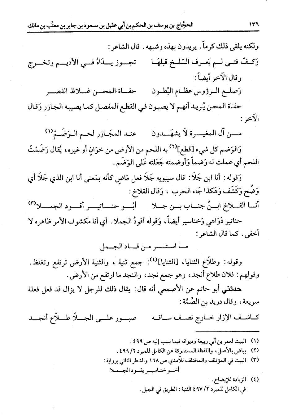 ولكنه يلقى ذلك كرما يريدون بهذه وشبهه قال الشاعر * وكف فتى لم يعرف السلخ قبلها * تجوز يداه في الأديم وتخرج * وقال الآخر أيضا * وصلع الرؤوس عظام البطون * حفاة المحن غلاظ القصر * حفاة المحن يريد أنهم لا يصبون في القطع المفصل كما يصيبه الجازر وقال الآخر * من آل المغيرة لا يشهدون * عند المجازر لحم الوضم * (1) والوضم كل شئ قطع (2) به اللحم من الأرض من خوان أو غيره يقال وضمت اللحم أي عملت له وضما وأوضمته جعلته على الوضم وقوله أنا ابن جلا قال سيبويه جلا فعل ماض كأنه بمعنى أنا ابن الذي جلا أي وضح وكشف وهكذا جاء الحرب وقال القلاخ * أنا القلاخ ابن جناب بن جلا * أبو حناتير أقود الجملا * (3) حناتير دواهي وخناسير أيضا وقوله أقود الجملا أي أنا مكشوف الأمر ظاهره لا أخفى كما قال الشاعر * ما استسر من قاد الجمل وقوله وطلاع الثنايا الثنايا (4) جمع ثنية والثنية الأرض ترتفع وتغلظ وقولهم فلان طلاع أنجد وهو جمع نجد والنجد ما ارتفع من الأرض حدثني أبو حاتم عن الأصمعي أنه قال يقال ذلك للرجل لا يزال قد فعل فعلة سريعة وقال دريد بن الصمة * كاشف الإزار خارج نصف ساقه * صبور على الجلا طلاع أنجد *