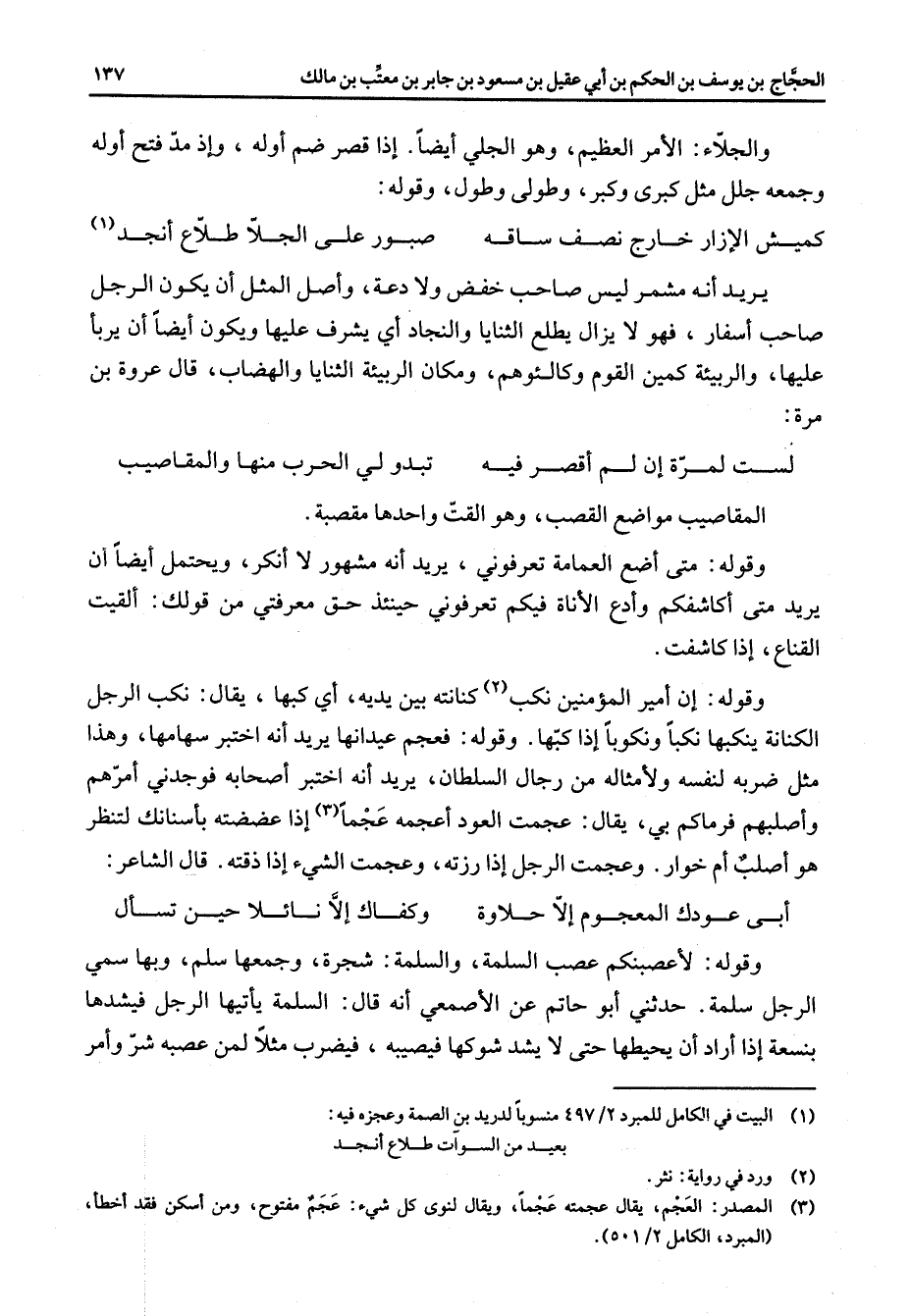 والجلاء الأمر العظيم وهو الجلي أيضا إذا قصر ضم أوله وإذا مدفتح أوله وجمعه جلل مثل كبرى وكبر وطولي وطول وقوله * كميش الإزار خارج نصف ساقه * صبور على الجلا طلاع أنجد * (1) يريد أنه مشمر ليس صاحب خفض ولا دعة وأصل المثل أن يكون الرجل صاحب أسفار فهو لا يزال يطلع الثنايا والنجاد أي يشرف عليها ويكون أيضا أن يربأ عليها والربيئة كمين القوم وكالئوهم ومكان الربيئة الثنايا والهضاب قال عروة بن مرة * لست لمرة إن لم أقصر فيه * تبدو لي الحرب منها والمقاصيب * المقاصيب مواضع القصب وهو القت واحدها مقصبة وقوله متى أضع العمامة تعرفوني يريد أنه مشهور لا أنكر ويحتمل أيضا أن يريد متى أكاشفكم وأدع الأناة فيكم تعرفوني حينئذ حق معرفتي من قولك ألقيت القناع إذا كاشفت وقوله إن أمير المؤمنين نكب (2) كنانته بين يديه أي كبها يقال نكب الرجل الكنانة ينكبها نكبا ونكوبا إذا كبها وقوله فعجم عيدانها يريد أنه اختبر سهامها وهذا مثل ضربه لنفسه ولأمثاله من رجال السلطان يريد أنه اختبر أصحابه فوجدني أمرهم وأصلبهم فرماكم بي يقال عجمت العود أعجمه عجما (3) إذا عضضته بأسنانك لتنظر هو أصلب أم خوار وعجمت الرجل إذا زرته وعجمت الشئ إذا ذقته قال الشاعر * أبى عودك المعجوم إلا حلاوة * وكفاك إلا نائلا حين تسأل * وقوله لأعصبنكم عصب السلمة والسلمة شجرة وجمعها سلم وبها سمي الرجل سلمة حدثني أبو حاتم عن الأصمعي أنه قال السلمة يأتيها الرجل فيشدها بنسعة إذا أراد أن يحيطها حتى لا يشد شوكها فيصيبه فيضرب مثلا لمن عصبه شر وأمر