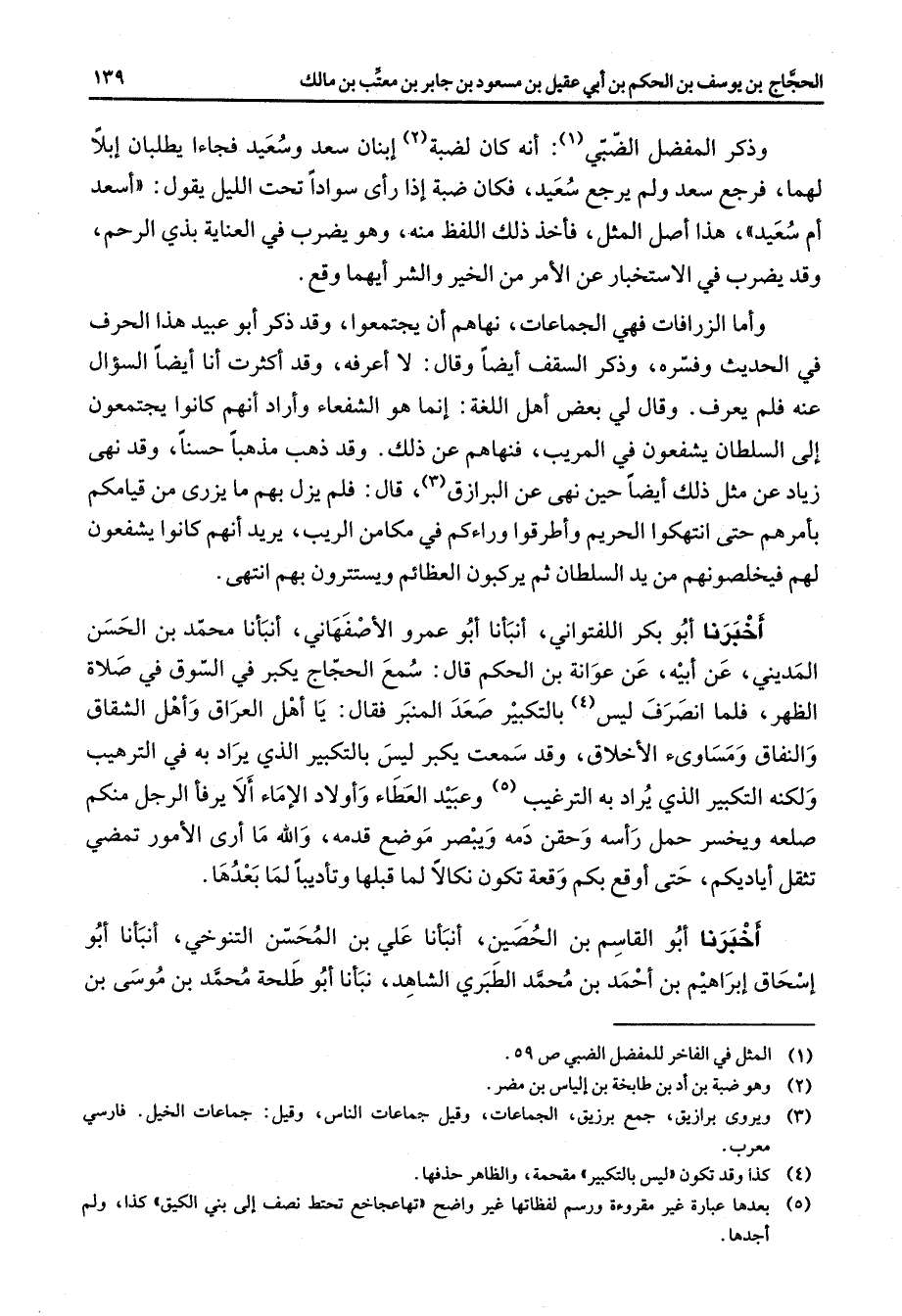 وذكر المفضل الضبي (1) أنه كان لضبة (2) ابنان سعد وسعيد فجاءا يطلبان إبلا لهما فرجع سعد ولم يرجع سعيد فكان ضبة إذا رأى سوادا تحت الليل يقول أسعد أم سعيد هذا أصل المثل فأخذ ذلك اللفظ منه وهو يضرب في العناية بذي الرحم وقد يضرب في الاستخبار عن الأمر من الخير والشر أيهما وقع وأما الزرافات فهي الجماعات نهاهم أن يجتمعوا وقد ذكر أبو عبيد هذا الحرف في الحديث وفسره وذكر السقف أيضا وقال لا أعرفه وقد أكثرت أنا أيضا السؤال عنه فلم يعرف وقال لي بعض أهل اللغة إنما هو الشفعاء وأراد أنهم كانوا يجتمعون إلى السلطان يشفعون في المريب فنهاهم عن ذلك وقد ذهب مذهبا حسنا وقد نهى زياد عن مثل ذلك أيضا حين نهى عن البرازق (1) قال فلم يزل بهم ما يزرى من قيامكم بأمرهم حتى انتهكوا الحريم وأطرقوا وراءكم في مكامن الريب يريد انهم كانوا يشفعون لهم فيخلصونهم من يد السلطان ثم يركبون العظائم ويستترون بهم انتهى أخبرنا أبو بكر اللفتواني أنبأنا أبو عمرو الأصفهاني أنبأنا محمد بن الحسن المديني عن أبيه عن عوانة بن الحكم قال سمع الحجاج يكبر في السوق في صلاة الظهر فلما انصرف ليس (4) بالتكبير صعد المنبر فقال يا أهل العراق وأهل الشقاق والنفاق ومساوئ الأخلاق وقد سمعت يكبر ليس بالتكبير الذي يراد به في الترهيب ولكنه التكبير الذي يراد به الترغيب (5) وعبيد العطاء وأولاد الإماء ألا يرفأ الرجل منكم صلعه ويخسر حمل رأسه وحقن دمه ويبصر موضع قدمه والله ما أرى الأمور تمضي تثقل أياديكم حتى أوقع بكم وقعة تكون نكالا لما قبلها وتأديبا لما بعدها أخبرنا أبو القاسم بن الحصين أنبأنا علي بن المحسن التنوخي أنبأنا أبو إسحاق إبراهيم بن أحمد بن محمد الطبري الشاهد نبأنا أبو طلحة محمد بن موسى بن