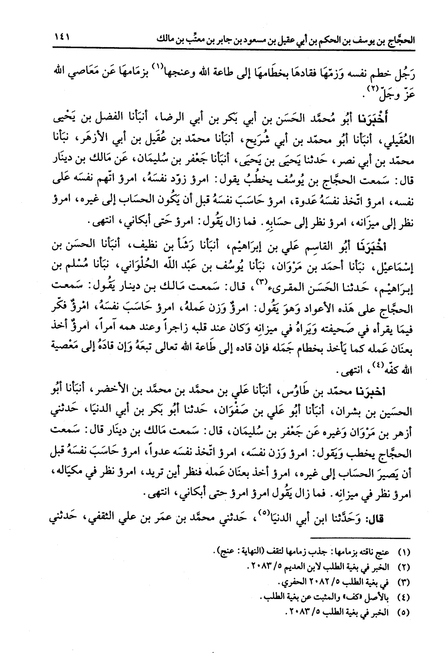 رجل خطم نفسه وزمها فقادها بخطامها إلى طاعة الله وعنجها (1) بزمامها عن معاصي الله عز وجل (2) أخبرنا أبو محمد الحسن بن أبي بكر بن أبي الرضا أنبأنا الفضل بن يحيى العقيلي أنبأنا أبو محمد بن أبي شريح أنبأنا محمد بن عقيل بن أبي الأزهر نبأنا محمد بن أبي نصر حدثنا يحيى بن يحيى أنبأنا جعفر بن سليمان عن مالك بن دينار قال سمعت الحجاج بن يوسف يخطب يقول امرؤ زود نفسه امرؤ اتهم نفسه على نفسه امرؤ اتخذ نفسه عدوة امرؤ حاسب نفسه قبل أن يكون الحساب إلى غيره امرؤ نظر إلى ميزانه امرؤ نظر إلى حسابه فما زال يقول امرؤ حتى أبكاني انتهى أخبرنا أبو القاسم علي بن إبراهيم أنبأنا رشأ بن نظيف أنبأنا الحسن بن إسماعيل نبأنا أحمد بن مروان نبأنا يوسف بن عبد الله الحلواني نبأنا مسلم بن إبراهيم حدثنا الحسن المقرئ (3) قال سمعت مالك بن دينار يقول سمعت الحجاج على هذه الأعواد وهو يقول امرؤ وزن عمله امرؤ حاسب نفسه امرؤ فكر فيما يقرأه في صحيفته ويراه في ميزانه وكان عند قلبه زاجرا وعند همه آمرا أخذ بعنان عمله كما يأخذ بخطام جمله فإن قاده إلى طاعة الله تعالى تبعه وإن قاده إلى معصية الله كفه (4) انتهى أخبرنا محمد بن طاوس أنبأنا علي بن محمد بن محمد بن الأخضر أنبأنا أبو الحسين بن بشران أنبأنا أبو علي بن صفوان حدثنا أبو بكر بن أبي الدنيا حدثني أزهر بن مروان وغيره عن جعفر بن سليمان قال سمعت مالك بن دينار قال سمعت الحجاج يخطب ويقول امرؤ وزن نفسه امرؤ اتخذ نفسه عدوا امرؤ حاسب نفسه قبل أن يصير الحساب إلى غيره امرؤ أخذ بعنان عمله فنظر أين تريد امرؤ نظر في مكياله امرؤ نظر في ميزانه فما زال يقول امرؤ امرؤ حتى أبكاني انتهى قال وحدثنا ابن أبي الدنيا (5) حدثني محمد بن عمر بن علي الثقفي حدثني