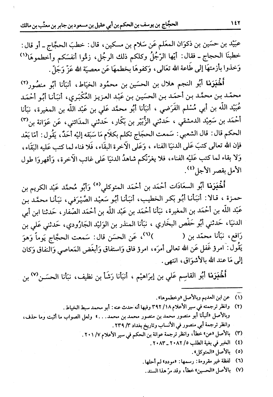 عبيد بن حسين بن ذكوان المعلم عن سلام بن مسكين قال خطب الحجاج أو قال خطبنا الحجاج فقال أيها الرجل وكلكم ذلك الرجل زموا أنفسكم وأخطموها (1) وخذوا بأزمتها إلى طاعة الله تعالى وكفوها بخطمها عن معصية الله عز وجل أخبرنا أبو النجم هلال بن الحسين بن محمود الخياط أنبأنا أبو منصور (2) محمد بن محمد بن أحمد بن الحسين بن عبد العزيز العكبري أنبأنا أبو أحمد عبيد الله بن أبي مسلم الفرضي أنبأنا أبو محمد علي بن عبد الله بن المغيرة نبأنا أحمد بن سعيد الدمشقي حدثني الزبير بن بكار حدثني المدائني عن عوانة بن (3) الحكم قال قال الشعبي سمعت الحجاج تكلم بكلام ما سبقه إليه أحد يقول أما بعد فإن الله تعالى كتب على الدنيا الفناء وعلى الآخرة البقاء فلا فناء لما كتب عليه البقاء ولا بقاء لما كتب عليه الفناء فلا يغرنكم شاهد الدنيا على غائب الآخرة وأقهروا طول الأمل بقصر الأجل (4) أخبرنا أبو السعادات أحمد بن أحمد المتوكلي (5) وأبو محمد عبد الكريم بن حمزة قالا أنبأنا أبو بكر الخطيب أنبأنا أبو سعيد الصيرفي نبأنا محمد بن عبد الله بن أحمد بن المغيرة نبأنا أحمد بن عبد الله بن أحمد الصفار حدثنا ابن أبي الدنيا حدثني أبو حفص البخاري نبأنا المنذر بن الوليد الجارودي حدثني علي بن رافع نبأنا محمد بن (6) عن الحسن قال سمعت الحجاج يوما وهو يقول امرؤ غفل عن الله تعالى أمره امرؤ فاق واستفاق وأبغض المعاصي والنفاق وكان إلى ما عند الله بالأشواق انتهى أخبرنا أبو القاسم علي بن إبراهيم أنبأنا رشأ بن نظيف نبأنا الحسن (7) بن