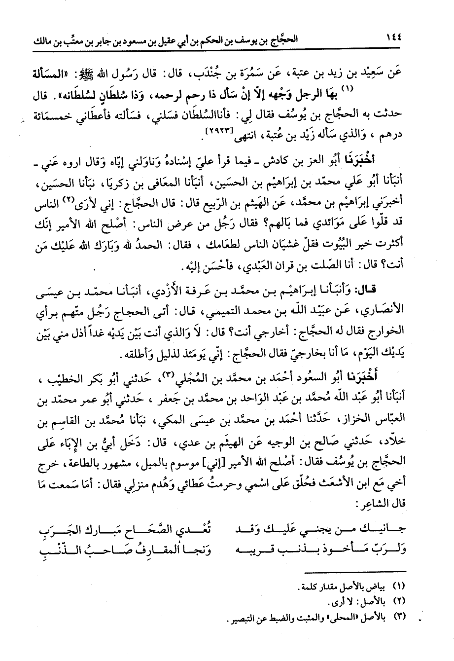 [2923] أخبرنا أبو العز بن كادش فيما قرأ علي إسناده وناولني إياه وقال اروه عني أنبأنا أبو علي محمد بن إبراهيم بن الحسين أنبأنا المعافى بن زكريا نبأنا الحسين أخبرني إبراهيم بن محمد عن الهيثم بن الربيع قال قال الحجاج إني لأرى (2) الناس قد قلوا على موائدي فما بالهم فقال رجل من عرض الناس أصلح الله الأمير إنك أكثرت خير البيوت فقل غشيان الناس لطعامك فقال الحمد لله وبارك الله عليك من أنت قال أنا الصلت بن قران العبدي فأحسن إليه قال وأنبأنا إبراهيم بن محمد بن عرفة الأزدي أنبأنا محمد بن عيسى الأنصاري عن عبيد الله بن محمد التميمي قال أتى الحجاج رجل متهم برأي الخوارج فقال له الحجاج أخارجي أنت قال لا والذي أنت بين يديه غدا أذل مني بين يديك اليوم ما أنا بخارجي فقال الحجاج إني يومئذ لذليل وأطلقه أخبرنا أبو السعود أحمد بن محمد بن المجلي (3) حدثني أبو بكر الخطيب أنبأنا أبو عبد الله محمد بن عبد الواحد بن محمد بن جعفر حدثني أبو عمر محمد بن العباس الخزاز حدثنا أحمد بن محمد بن عيسى المكي نبأنا محمد بن القاسم بن خلاد حدثني صالح بن الوجيه عن الهيثم بن عدي قال دخل أبي بن الإباء على الحجاج بن يوسف فقال أصلح الله الأمير إني موسوم بالميل مشهور بالطاعة خرج أخي مع ابن الأشعث فحلق على اسمي وحرمت عطائي وهدم منزلي فقال أم سمعت ما قال الشاعر * جانيك من يجني عليك وقد * تعدي الصحاح مبارك الجرب ولرب مأخوذ بذنب قريبه * ونجا المقارف صاحب الذنب *