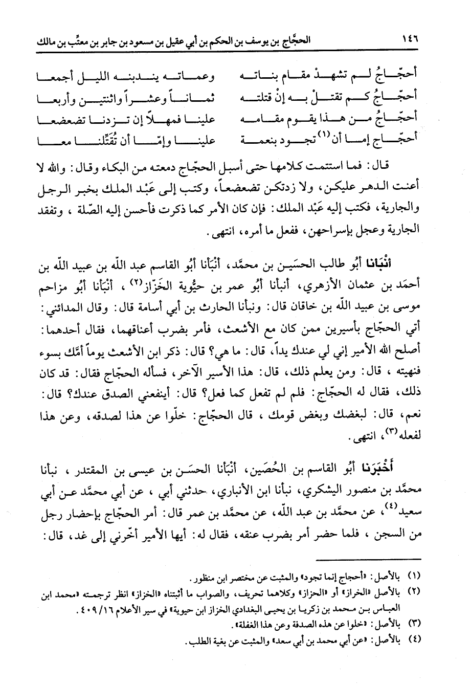 أحجاج لم تشهد مقام بناته * وعماته يندبنه الليل أجمعا أحجاج كم تقتل به إن قتلته * ثمانا وعشرا واثنتين وأربعا أحجاج من هذا يقوم مقامه * علينا فمهلا إن تزدنا تضعضعا أحجاج إما أن (1) تجود بنعمة * علينا وإما أن تقتلنا معا * قال فما استتمت كلامها حتى أسبل الحجاج دمعته من البكاء وقال والله لا أعنت الدهر عليكن ولا زدتكن تضعضعا وكتب إلى عبد الملك بخبر الرجل والجارية فكتب إليه عبد الملك فإن كان الأمر كما ذكرت فأحسن إليه الصلة وتفقد الجارية وعجل بإسراحهن ففعل ما أمره انتهى أنبأنا أبو طالب الحسين بن محمد أنبأنا أبو القاسم عبد الله بن عبيد الله بن أحمد بن عثمان الأزهري أنبأنا أبو عمر بن حيوية الخزاز (2) أنبأنا أبو مزاحم موسى بن عبيد الله بن خاقان قال ونبأنا الحارث بن أبي أسامة قال وقال المدائني أتي الحجاج بأسيرين ممن كان مع الأشعث فأمر بضرب أعناقهما فقال أحدهما أصلح الله الأمير إني لي عندك يدا قال ما هي قال ذكر ابن الأشعث يوما أمك بسوء فنهيته قال ومن يعلم ذلك قال هذا الأسير الآخر فسأله الحجاج فقال قد كان ذلك فقال له الحجاج فلم لم تفعل كما فعل قال أينفعني الصدق عندك قال نعم قال لبغضك وبغض قومك قال الحجاج خلوا عن هذا لصدقه وعن هذا لفعله (3) انتهى أخبرنا أبو القاسم بن الحصين أنبأنا الحسن بن عيسى بن المقتدر نبأنا محمد بن منصور اليشكري نبأنا ابن الأنباري حدثني أبي عن أبي محمد عن أبي سعيد (4) عن محمد بن عبد الله عن محمد بن عمر قال أمر الحجاج بإحضار رجل من السجن فلما حضر أمر بضرب عنقه فقال له أيها الأمير أخرني إلى غد قال