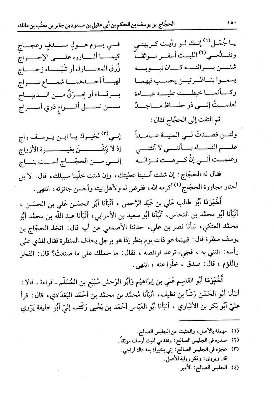 يا جمل (1) إنك لو رأيت كريهتي * في يوم هول مسدف وعجاج وتقدمي (2) الليث أسفر موثقا * كيما أثاوره على الإحراج شئن براثنه كان نيوبه * زرق المعاول أو شباه زجاج يسموا بناظرتين يحسب فيهما * لهبا أحدهما شعاع سراج وكأنما خيطت عليه عباءة * برقاء أو خرق من الديباج لعلمت إني ذو حفاظ ماجد * من نسل أقوام ذوي أمراج * ثم التفت إلى الحجاج فقال * ولئن قصدت لي المنية عامدا * إني (3) لخيرك يا ابن يوسف راج علم النساء بأنني لا أنثني * إذ لا يثقن بغيرة الأزواج وعلمت أني إن كرهت نزاله * إني من الحجاج لست بناج * فقال له الحجاج إن شئت أسنينا عطيتك وإن شئت خلينا سبيلك قال لا بل أختار مجاورة الحجاج (4) أكرمه الله ففرض له ولأهل بيته وأحسن جائزته انتهى أخبرنا أبو طالب علي بن عبد الرحمن أنبأنا أبو الحسن علي بن الحسن أنبأنا أبو محمد بن النحاس أنبأنا أبو سعيد بن الأعرابي أنبأنا عبد الله بن محمد أبو محمد العتكي نبأنا نصر بن علي حدثنا الأصمعي عن أبيه قال اتخذ الحجاج بن يوسف منظرة قال فبينما هو ذات يوم ينظر إذا هو برجل يحذف المنظرة فقال للذي على رأسه ائتني به فجئ ترعد فرائصه فقال ما حملك على ما صنعت قال الفخر واللؤم قال صدق خلوا عنه انتهى أخبرنا أبو القاسم علي بن إبراهيم وأبو الوحش سبيع بن المسلم قراءة قالا أنبأنا أبو الحسن رشأ بن نظيف أنبأنا محمد بن محمد بن احمد البغدادي قال قرأ علي أبو بكر بن الأنباري أنبأنا أبو العباس أحمد بن يحيى وكتب إلي أبو خليفة يروي