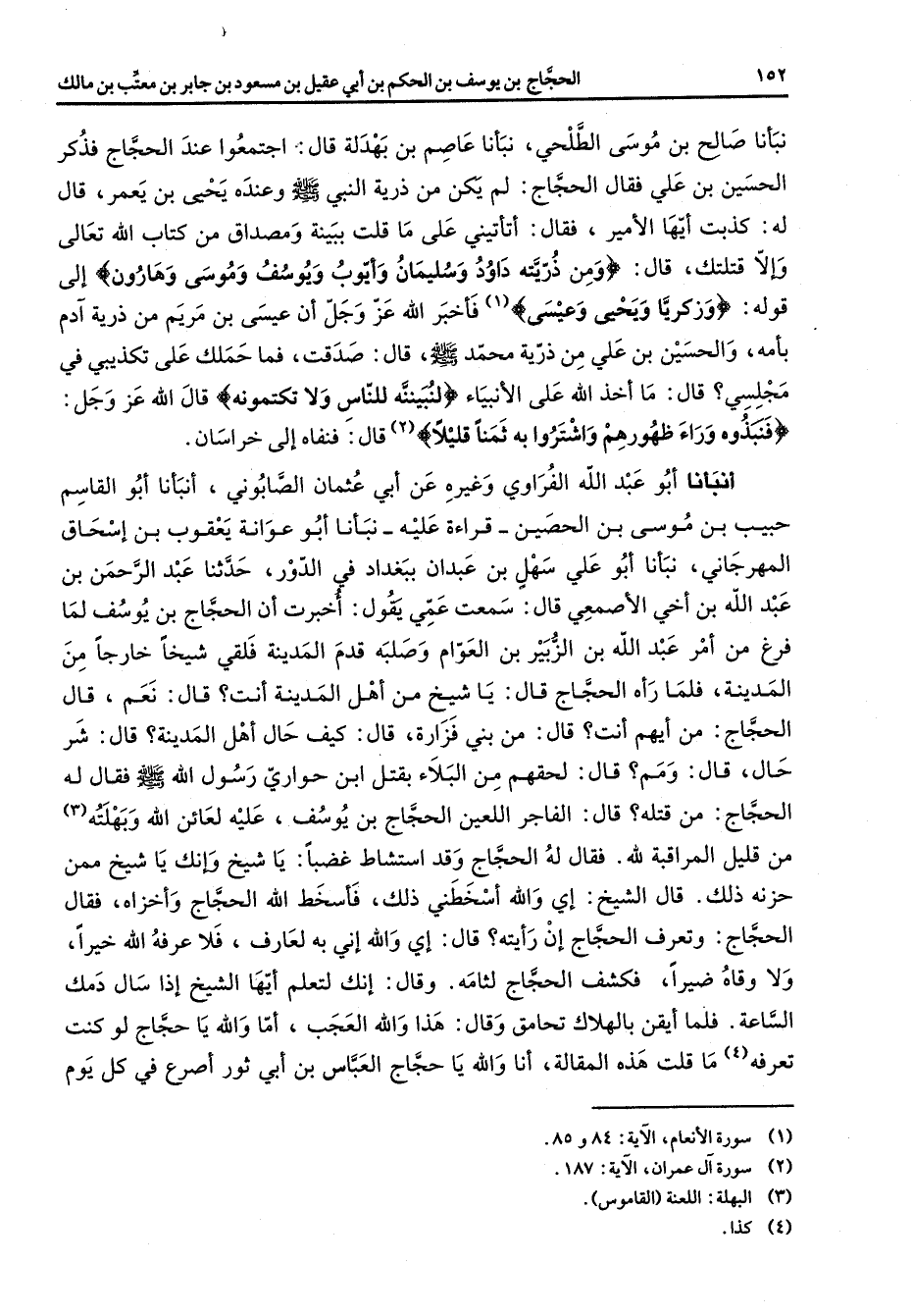 نبأنا صالح بن موسى الطلحي نبانا عاصم بن بهدلة قال اجتمعوا عند الحجاج فذكر الحسين بن علي فقال الحجاج لم يكن من ذرية النبي (صلى الله عليه وسلم) وعنده يحيى بن يعمر قال له كذبت أيها الأمير فقال أتأتيني على ما قلت ببينة ومصداق من كتاب الله تعالى وإلا قتلتك قال " ومن ذريته داود وسليمان وأيوب ويوسف وموسى وهارون " إلى قوله " وزكريا ويحيى وعيسى " (1) فأخبر الله عز وجل أن عيسى بن مريم من ذرية آدم بأمه والحسين بن علي من ذرية محمد (صلى الله عليه وسلم) قال صدقت فما حملك على تكذيبي في مجلسي قال ما أخذ الله على الأنبياء " لتبيننه للناس ولا تكتمونه " قال الله عز وجل " فنبذوه وراء ظهورهم واشتروا به ثمنا قليلا " (2) قال فنفاه إلى خراسان أنبانا أبو عبد الله الفراوي وغيره عن أبي عثمان الصابوني أنبأنا أبو القاسم حبيب بن موسى بن الحصين قراءة عليه نبأنا أبو عوانة يعقوب بن إسحاق المهرجاني نبأنا أبو علي سهل بن عبدان ببغداد في الدور حدثنا عبد الرحمن بن عبد الله بن أخي الأصمعي قال سمعت عمي يقول أخبرت أن الحجاج بن يوسف لما فرغ من أمر عبد الله بن الزبير بن العوام وصلبه قدم المدينة فلقي شيخا خارجا من المدينة فلما رآه الحجاج قال يا شيخ من أهل المدينة أنت قال نعم قال الحجاج من أيهم أنت قال من بني فزارة قال كيف حال أهل المدينة قال شر حال قال ومم قال لحقهم من البلاء بقتل ابن حواري رسول الله (صلى الله عليه وسلم) فقال له الحجاج من قتله قال الفاجر اللعين الحجاج بن يوسف عليه لعائن الله وبهلته (3) من قليل المراقبة لله فقال له الحجاج وقد استشاط غضبا يا شيخ وإنك يا شيخ ممن حزنه ذلك قال الشيخ أي والله أسخطني ذلك فأسخط الله الحجاج وأخزاه فقال الحجاج وتعرف الحجاج إن رأيته قال إي والله إني به لعارف فلا عرفه الله خيرا ولا وقاه ضيرا فكشف الحجاج لثامه وقال إنك لتعلم أيها الشيخ إذا سال دمك الساعة فلما أيقن بالهلاك تحامق وقال هذا والله العجب أما والله يا حجاج لو كنت تعرفه (4) ما قلت هذه المقالة أنا والله يا حجاج العباس بن أبي ثور أصرع في كل يوم