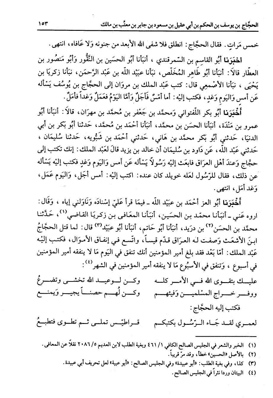 خمس مرات فقال الحجاج انطلق فلا شفى الله الأبعد من جنونه ولا عافاه انتهى اخبرنا أبو القاسم بن السمرقندي أنبأنا أبو الحسين بن النقور وأبو منصور بن العطار قالا أنبأنا أبو طاهر المخلص نبأنا عبيد الله بن عبد الرحمن نبأنا زكريا بن يحيى نبأنا الأصمعي قال كتب عبد الملك بن مروان إلى الحجاج بن يوسف يسأله عن امس واليوم وغد فكتب إليه أما أمس فأجل واما اليوم فعمل وغدا فأمل اخبرنا أبو بكر اللفتواني ومحمد بن جعفر بن محمد بن مهران قالا أنبأنا أبو عمرو بن مندة انبانا الحسن بن محمد أنبأنا احمد بن محمد حدثنا أبو بكر بن أبي الدنيا حدثني أبو بكر محمد بن هاني حدثني احمد بن شبويه حدثنا سليمان حدثني عبد الله عن داود بن سليمان أن خالد بن يزيد قال لعبد الملك انك تكتب إلى حجاج وعند أهل العراق فابعث إليه رسولا يسأله عن امس واليوم وغد فكتب إليه يسأله عن ذلك فقال للرسول لعله خويلد كان عنده اكتب إليه امس أجل واليوم عمل وغد أمل انتهى أخبرنا أبو العز احمد بن عبيد الله فيما قرأ علي إسناده وناولني إياه وقال اروه عني أنبأنا محمد بن الحسين أنبأنا المعافى بن زكريا القاضي (1) حدثنا محمد بن الحسن (2) بن دريد أنبأنا أبو حاتم أنبأنا أبو عبيد (3) قال لما قتل الحجاج ابن الاشعث وصفت له العراق قدم قيسا واتسع في انفاق الأموال فكتب إليه عبد الملك أما بعد فقد بلغ أمير المؤمنين انك تنفق في اليوم ما لا ينفقه أمير المؤمنين في اسبوع وتنفق في الاسبوع ما لا ينفقه أمير المؤمنين في الشهر * (4) عليك بتقوى الله في الأمر كله * وكن لوعيد الله تخشى وتضرع ووفر خراج المسلمين وفيئهم * وكن لهم حصنا يجير ويمنع * فكتب إليه الحجاج * لعمري لقد جاء الرسول بكتبكم * قراطيس تملى ثم تطوى فتطبع