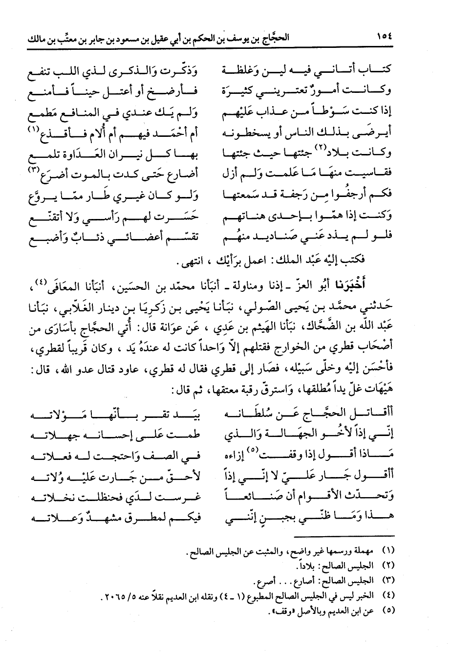 كتاب اتاني فيه لين وغلظة * وذكرت والذكرى لذي اللب تنفع وكانت أمور تعتريني كثيرة * فأرضخ أو اعتل حينا فامنع إذا كنت سوطا من عذاب عليهم * ولم يك عندي في المنافع مطمع ايرضي بذلك الناس أو يسخطونه * أم احمد فيهم أم ألام فأقذع (1) وكانت بلاد (2) جئتها حيث جئتها * بها كل نيران العداوة تلمع فقاسيت منها ما علمت ولم ازل * اضارع حتى كدت بالموت اضرع (3) فكم ارجفوا من رجفة قد سمعتها * ولو كان غيري طار مما يروع وكنت إذا هموا باحدى هناتهم * حسرت لهم راسي ولا اتقنع فلو لم يذد عني صناديد منهم * تقسم اعضائي ذئاب واضبع * فكتب إليه عبد الملك اعمل برأيك انتهى اخبرنا أبو العز اذنا ومناولة أنبأنا محمد بن الحسين أنبأنا المعافى (4) حدثني محمد بن يحيى الصولي نبأنا يحيى بن زكريا بن دينار الغلابي نبأنا عبد الملك بن الضحاك نبأنا الهيثم بن عدي عن عوانة قال اتي الحجاج بأساري من أصحاب قطري من الخوارج فقتلهم إلا واحدا كانت له عنده يد وكان قريبا لقطري فاحسن إليه وخلى سبيله فصار إلى قطري فقال له قطري عاود قتال عدو الله قال هيهات غل يدا مطلقها واسترق رقبة معتقها ثم قال * أأقاتل الحجاج عن سلطانه * بيد تقر بأنها مولاته أني إذا لاخو الجهالة والذي * طمت على احسانه جهلاته ماذا اقول إذا وقفت (5) إزاءه * في الصف واحتجت له فعلاته وتحدث الأقوام أن صنائعا * غرست لدي فحنظلت نخلاته هذا وما ظني بجبن انني * فيكم لمطرق مشهد وعلاته *