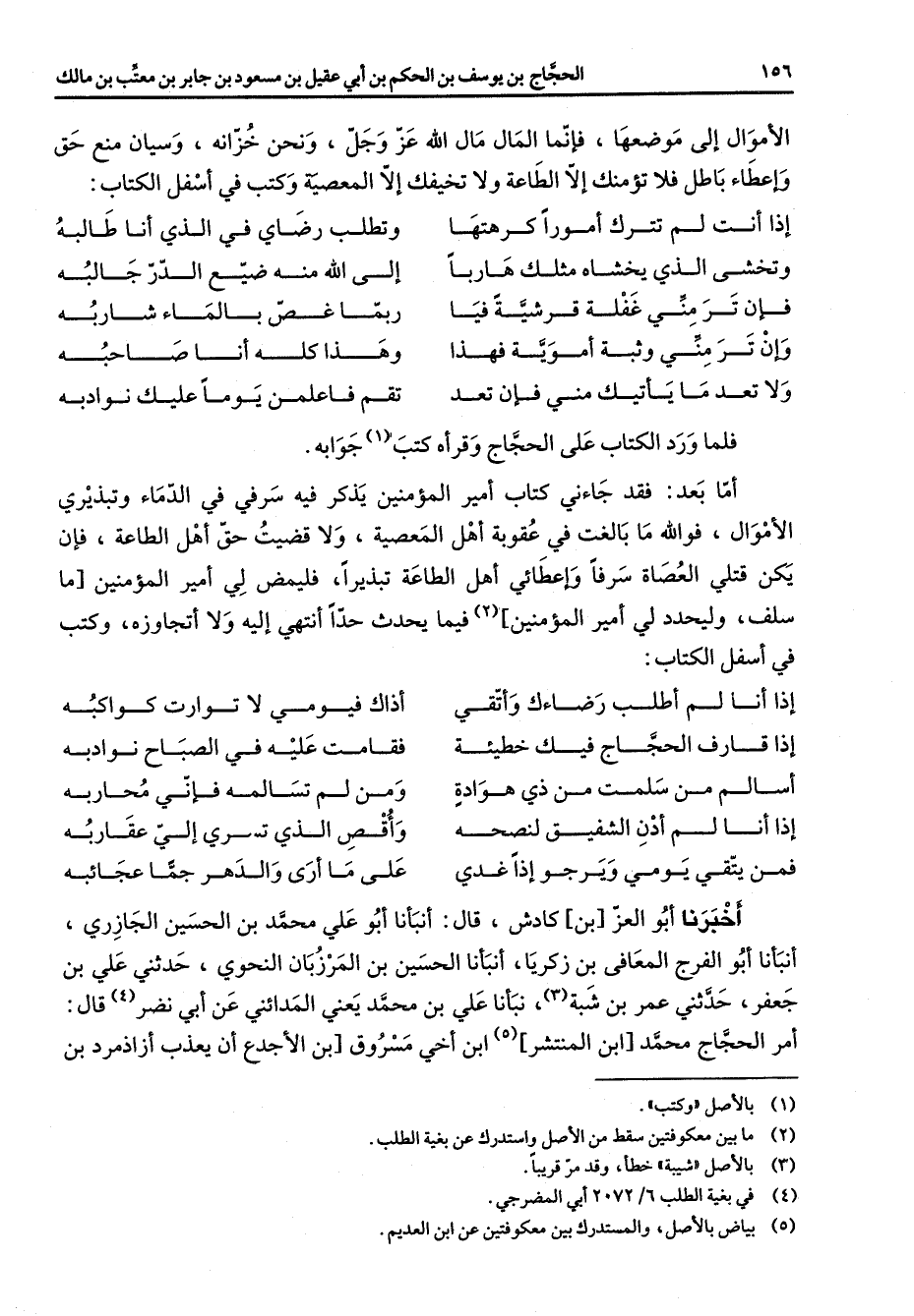 الأموال الي موضعها فإنما المال الله عز وجل ونحن خزانة وسيان منع حق واعطاء باطل فلا تؤمنك إلا الطاعة ولا تخيفك إلا المعصية وكتب في اسفل الكتاب * إذا أنت لم تترك أمورا كرهتها * وتطلب رضاي في الذي أنا طالبه وتخشى الذي يخشاه مثلك هاربا * إلى الله منه ضيع الدر جالبه فان ترمني غفلة قرشية فيا * ربما غص بالماء شاربه وان ترمني وثبة اموية فهذا * وهذا كله أنا صاحبه ولا تعد ما ياتيك مني فان تعد * تقم فاعلمن يوما عليك نوادبه * فلما ورد الكتاب على الحجاج وقرأه كتب (1) جوابه أما بعد فقد جاءني كتاب أمير المؤمنين يذكر فيه سرفي في الدماء وتبذيري الأموال فو الله ما بالغت في عقوبة أهل المعصية ولا قضيت حق أهل الطاعة فان يكن قتلي العصاة سرفا واعطائي أهل الطاعة تبذيرا فليمض لي أمير المؤمنين ما سلف وليحدد لي أمير المؤمنين (2) فيما يحدث حدا انتهى إليه ولا اتجاوزه وكتب في اسفل الكتاب * إذا أنا لم اطلب رضاءك واتقي * اذاك فيومي لا توارت كواكبه إذا قارف الحجاج فيك خطيئة * فقامت عليه في الصباح نوادبه اسالم من سلمت من ذي هوادة * ومن لم تسالمه فإني محاربه إذا أنا لم أدن الشفيق لنصحه * واقص الذي تسري الي عقاربه فمن يتقي يومي ويرجو إذا غدي * على ما ارى والدهر جما عجائبه * اخبرنا أبو العز بن كادش قال أنبأنا أبو علي محمد بن الحسين الجازري أنبأنا أبو الفرج المعافى بن زكريا أنبأنا الحسين بن المرزبان النحوي حدثني علي بن جعفر حدثني عمر بن شبة (3) نبأنا علي بن محمد يعني المدائني عن أبي نضر (4) قال أمر الحجاج محمد ابن المنتشر (5) ابن اخي مسروق بن الاجدع أن يعذب ازاذمرد بن