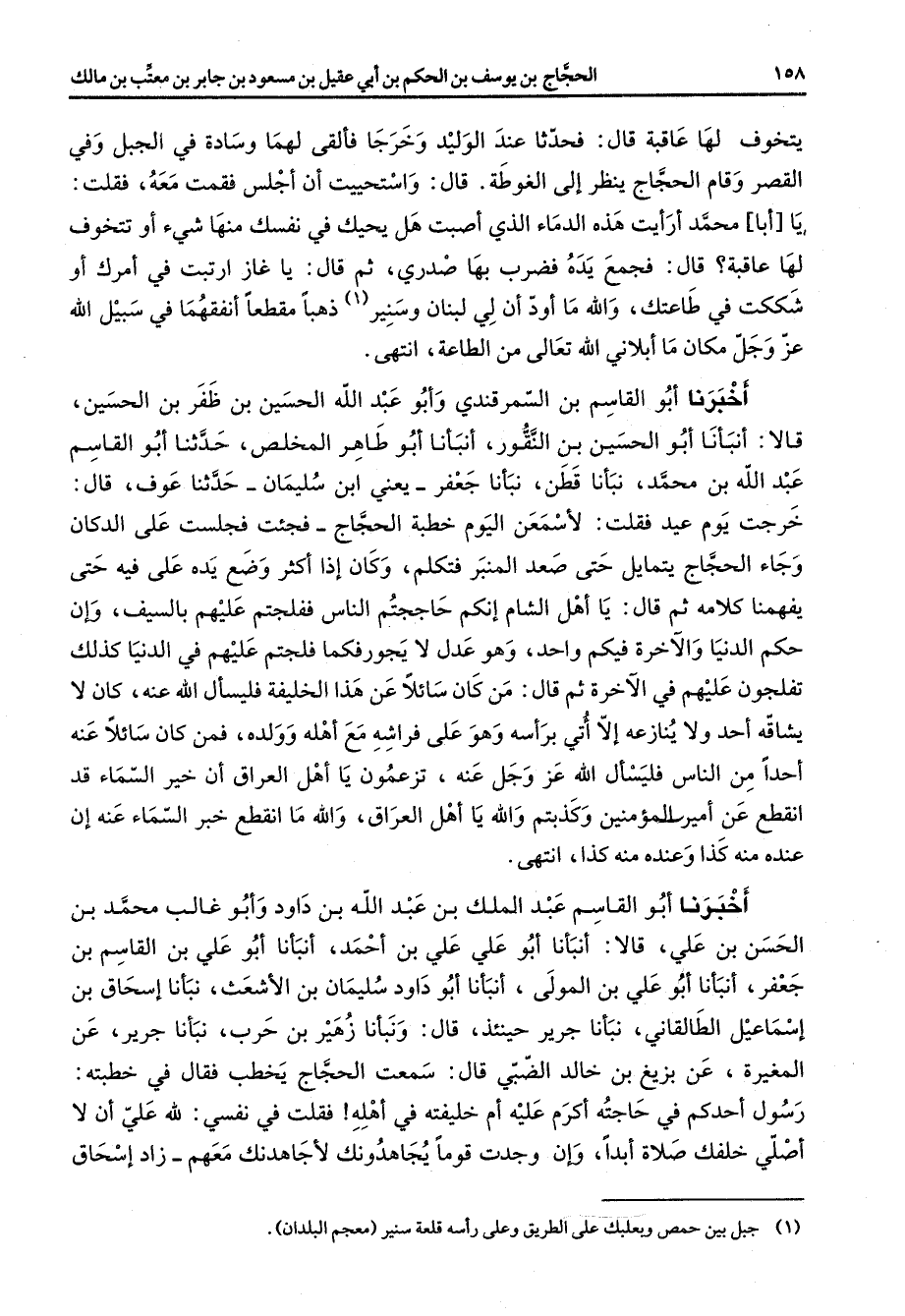 يتخوف لها عاقبة قال فحدثا عند الوليد وخرجا فالقى لهما وسادة في الجبل وفي القصر وقام الحجاج ينظر إلى الغوطة قال واستحييت أن اجلس فقمت معه فقلت يا أبا محمد أرأيت هذه الدماء الذي اصبت هل يحيك في نفسك منها شئ أو تتخوف لها عاقبة قال فجمع يده فضرب بها صدري ثم قال يا غاز ارتبت في امرك أو شككت في طاعتك والله ما اود أن لي لبنان وسنير (1) ذهبا مقطعا أنفقهما في سبيل الله عز وجل مكان ما ابلاني الله تعالى من الطاعة انتهى اخبرنا أبو القاسم بن السمرقندي وأبو عبد الله الحسين بن ظفر بن الحسين قالا أنبأنا أبو الحسين بن النقور أنبأنا أبو طاهر المخلص حدثنا أبو القاسم عبد الله بن محمد نبأنا قطن نبأنا جعفر يعني ابن سليمان حدثنا عوف قال خرجت يوم عيد فقلت لاسمعن اليوم خطبة الحجاج فجئت فجلست على الدكان وجاء الحجاج يتمايل حتى صعد المنبر فتكلم وكان إذا اكثر وضع يده على فيه حتى يفهمنا كلامه ثم قال يا أهل الشام انكم حاججتم الناس ففلجتم عليهم بالسيف وان حكم الدنيا والاخرة فيكم واحد وهو عدل لا يجور فكما فلجتم عليهم في الدنيا كذلك تفلجون عليهم في الاخرة ثم قال من كان سائلا عن هذا الخليفة فليسأل الله عنه كان لا يشاقه أحد ولا ينازعه إلا اتي برأسه وهو على فراشه مع أهله وولده فمن كان سائلا عنه أحدا من الناس فليسأل الله عز وجل عنه تزعمون يا أهل العراق أن خير السماء قد انقطع عن أمير المؤمنين وكذبتم والله يا أهل العراق والله ما انقطع خبر السماء عنه أن عنده منه كذا وعنده منه كذا انتهى اخبرنا أبو القاسم عبد الملك بن عبد الله بن داود وأبو غالب محمد بن الحسن بن علي قالا أنبأنا أبو علي علي بن أحمد أنبأنا أبو علي بن القاسم بن جعفر أنبأنا أبو علي بن المولى أنبأنا أبو داود سليمان بن الأشعث نبأنا اسحاق بن اسماعيل الطالقاني نبأنا جرير حينئذ قال ونبأنا زهير بن حرب نبأنا جرير عن المغيرة عن بزيغ بن خالد الضبي قال سمعت الحجاج يخطب فقال في خطبته رسول احدكم في حاجته اكرم عليه أم خليفته في أهله فقلت في نفسي لله علي أن لا اصلي خلفك صلاة أبدا وان وجدت قوما يجاهدونك لاجاهدنك معهم زاد اسحاق