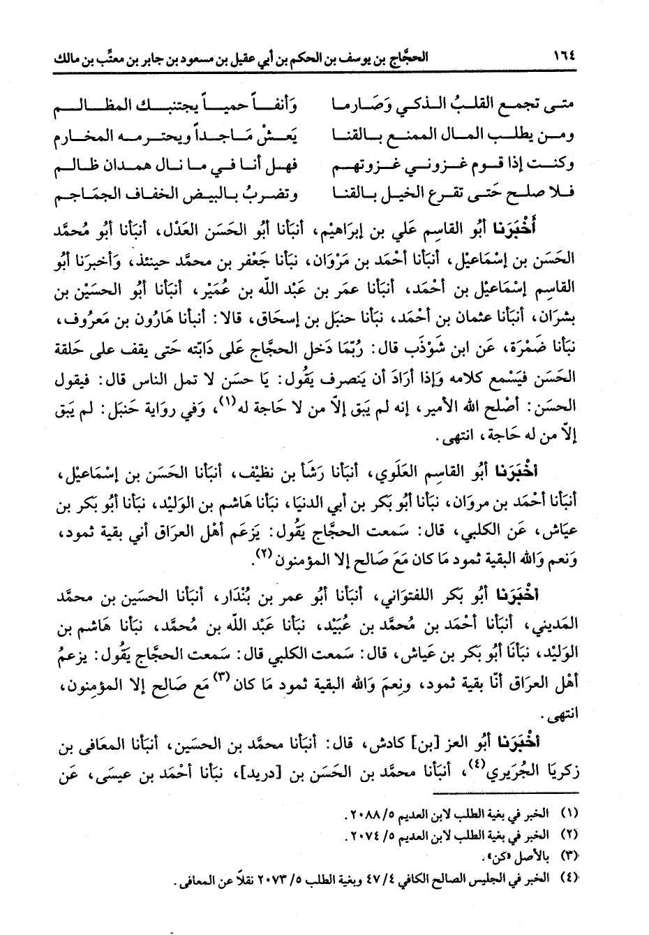 متى تجمع القلب الذكي وصارما * وانفا حميا يجتنبك المظالم ومن يطلب المال الممنع بالقنا * يعش ماجد ويحترمه المخارم وكنت إذا قوم غزوني غزوتهم * فهل أنا في ما نال همدان ظالم فلا صلح حتى تقرع الخيل بالقنا * وتضرب بالبيض الخفاف الجماجم * اخبرنا أبو القاسم علي بن إبراهيم أنبأنا أبو الحسن العدل أنبأنا أبو محمد الحسن بن اسماعيل أنبأنا احمد بن مروان نبأنا جعفر من محمد حينئذ واخبرنا أبو القاسم بن احمد نبأنا حنبل بن اسحاق قالا أنبأنا هارون بن معروف نبأنا ضمرة عن ابن شوذب قال ربما دخل الحجاج على دابته حتى يقف على حلقة الحسن فيسمع كلامه وإذا أراد أن ينصرف يقول يا حسن لا تمل الناس قال فيقول الحسن اصلح الله الأمير انه لم يبق إلا من لا حاجة له (1) وفي رواية حنبل لم يبق إلا من له حاجة انتهى اخبرنا أبو القاسم العلوي أنبأنا رشأ بن نظيف أنبأنا الحسن بن اسماعيل أنبأنا احمد بن مروان نبأنا أبو بكر بن أبي الدنيا نبأنا هاشم بن الوليد نبأنا أبو بكر بن عياش عن الكلبي قال سمعت الحجاج يقول يزعم أهل العراق أني بقية ثمود ونعم والله البقية ثمود ما كان مع صالح إلا المؤمنون (2)