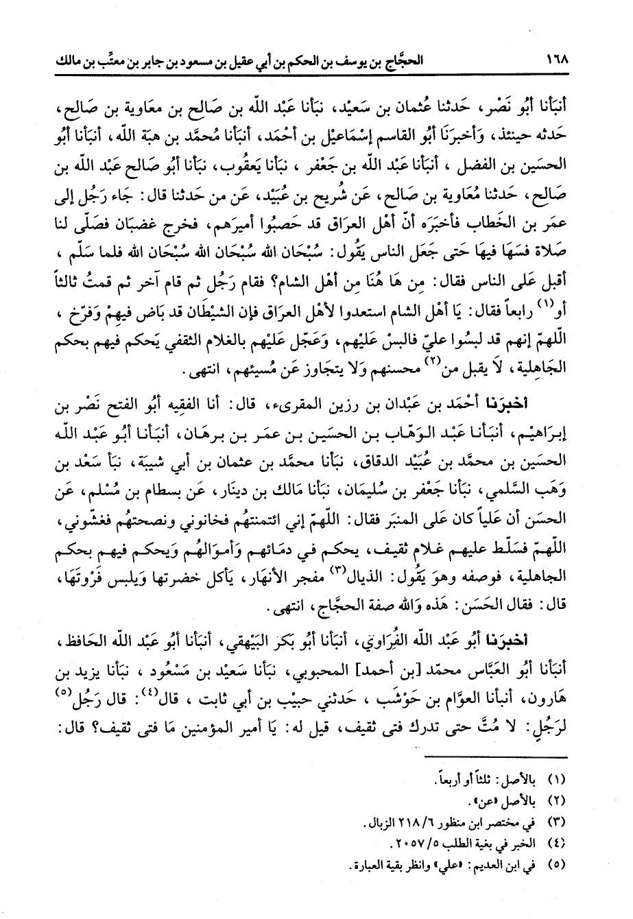 أنبأنا أبو نصر حدثنا عثمان بن سعيد نبأنا عبد الله بن صالح بن معاوية بن صالح حدثه حينئذ واخبرنا أبو القاسم اسماعيل بن احمد أنبأنا محمد بن هبة الله أنبأنا أبو الحسين بن الفضل أنبأنا عبد الله بن جعفر نبأنا يعقوب نبأنا أبو صالح عبد الله بن صالح حدثنا معاوية بن صالح عن شريح بن عبيد عن من حدثنا قال جاء رجل إلى عمر بن الخطاب فاخبره أن أهل العراق قد حصبوا أميرهم فخرج غضبان فصلى لنا صلاة فسها فيها حتى جعل الناس يقول سبحان الله سبحان الله فلما سلم اقبل على الناس فقال من ها هنا من أهل الشام فقام رجل ثم قام آخر ثم قمت ثالثا أو (1) رابعا فقال يا أهل الشام استعدوا لأهل العراق فان الشيطان قد باض فيهم وفرخ اللهم انهم قد لبسوا علي فالبس عليهم وعجل عليهم بالغلام الثقفي يحكم فيهم بحكم الجاهلية لا يقبل من (2) محسنهم ولا يتجاوز عن مسيئهم انتهى اخبرنا احمد بن عبدان بن رزين المقرئ قال أنا الفقيه أبو الفتح نصر بن إبراهيم أنبأنا عبد الوهاب بن الحسين بن عمر بن برهان أنبأنا أبو عبد الله الحسين بن محمد بن عبيد الدقاق نبأنا محمد بن عثمان بن أبي شيبة نبأ سعد بن وهب السلمي نبأنا جعفر بن سليمان نبأنا مالك بن دينار عن بسطام بن مسلم عن الحسن أن عليا كان على المنبر فقال اللهم أني ائتمنتهم فخانوني ونصحتهم فغشوني اللهم فسلط عليهم غلام ثقيف يحكم في دمائهم واموالهم ويحكم فيهم بحكم الجاهلية فوصفه وهو يقول الذيال (3) مفجر الأنهار يأكل خضرتها ويلبس فروتها قال فقال الحسن هذه والله صفة الحجاج انتهى اخبرنا أبو عبد الله الفراوي أنبأنا أبو بكر البهيقي أنبأنا أبو عبد الله الحافظ أنبأنا أبو العباس محمد بن احمد المحبوبي نبأنا سعيد بن مسعود نبأنا يزيد من هارون أنبأنا العوام بن حوشب حدثني حبيب بن أبي ثابت قال (4) قال رجل (5) لرجل لا مت تدرك فتى ثقيف قيل له يا أمير المؤمنين ما فتى ثقيف قال