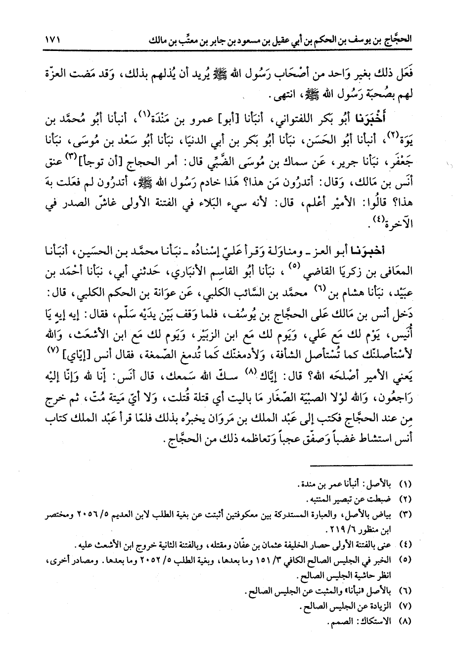 فعل ذلك بغير واحد من أصحاب رسول الله (صلى الله عليه وسلم) يريد أن يذلهم بذلك وقد مضت العزة لهم بصحبة رسول الله (صلى الله عليه وسلم) انتهى اخبرنا أبو بكر اللفتواني أنبأنا أبو عمرو بن مندة (1) أنبأنا أبو محمد بن يوة (2) أنبأنا أبو الحسن نبأنا أبو بكر بن أبي الدنيا نبأنا أبو سعد بن موسى نبأنا جعفر نبأنا جرير عن سماك بن موسى الضبي قال أمر الحجاج أن توجأ (3) عنق انس بن مالك وقال أتدرون من هذا هذا خادم رسول الله (صلى الله عليه وسلم) أتدرون لم فعلت به هذا قالوا الامير اعلم قال لانه سئ البلاء في الفتنة الأولى غاش الصدر في الاخرة (4)