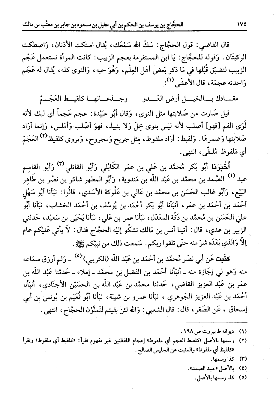 قال القاضي قول الحجاج سك الله سمعك يقال استكت الأذنان واصطكت الركبتان وقوله للحجاج يا ابن المستفرمة بعجم الزبيب كانت المرأة تستعمل عجم الزبيب لتضيق قبلها في ما ذكر بعض أهل العلم وهو حبه والنوى كله يقال له عجم واحدته عجمة قال الاعشى * (1) مقادك بالخيل أرض العدو * وجذعانها كلقيط العجم * قيل صارت من صلابتها مثل النوى وقال أبو عبيدة عجم عجما أي لبك لانه لوى الفم فهو اصلب لانه ليس بنوى خل ولا بنبيذ فهو اصلب واملس وانما أراد صلابتها وضمرها ولقيط أراد ملقوط مثل جريح ومجروح ويروى كلفيظ (2) العجم أي ملفوظ ملقى انتهى اخبرنا أبو بكر محمد بن علي بن عمر الكابلي وأبو القائلي (3) وأبو القاسم عبد (4) الصمد بن محمد بن عبد الله بن مندوية وأبو المطهر شاكر بن نصر بن طاهر البيع وأبو غالب الحسن بن محمد بن عالي بن علوكة الاسدي قالوا نبأنا أبو سهل احمد بن احمد بن عمر أنبأنا أبو بكر احمد بن يوسف بن احمد الخشاب نبأنا أبو علي الحسن بن محمد بن دكة المعدل نبأنا عمر بن علي نبأنا يحيى بن سعيد حدثني الزبير بن عدي قال آتينا انس بن مالك نشكوا إليه الحجاج فقال لا يأتي عليكم عام ألا والذي بعده شر منه حتى تلقوا ربكم سمعت ذلك من نبيكم (صلى الله عليه وسلم) كتبت عن أبي نصر محمد بن احمد بن عبد الله الكريبي (5) ولم أرزق سماعه منه وهو لي اجازة منه أنبأنا احمد بن الفضل بن محمد املاء حدثنا عبد الله بن عمر بن عبد العزيز القاضي حدثنا محمد بن عبد الله بن الحسين الاجنادي أنبأنا احمد بن عبد العزيز الجوهري نبأنا عمرو بن شيبة نبأنا أبو نعيم بن يونس بن أبي إسحاق عن الصقر قال قال الشعبي والله لئن بقيتم لتمنون الحجاج انتهى