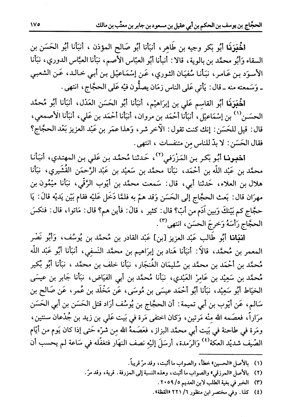 اخبرنا أبو بكر وجيه بن طاهر أنبأنا أبو صالح المؤذن أنبأنا أبو الحسن بن السقاء وأبو محمد بن بالوية قالا أنبأنا أبو العباس الاصم نبأنا العباس الدوري نبأنا الاسود بن عامر نبأنا سفيان الثوري عن اسماعيل بن أبي خالد عن الشعبي وسمعته منه قال يأتي على الناس زمان يصلون فيه على الحجاج انتهى اخبرنا أبو القاسم على بن إبراهيم أنبأنا أبو الحسن العدل أنبأنا أبو محمد الحسن (1) بن اسماعيل أنبأنا احمد بن مروان أنبأنا احمد بن علي أنبأنا الأصمعي قال قيل للحسن انك كنت تقول الآخر شر وهذا عمر بن عبد العزيز بعد الحجاج فقال الحسن لا بد للناس من متنفسات انتهى اخبرنا أبو بكر بن المزرفي (2) حدثنا محمد بن علي بن المهتدي أنبأنا محمد بن عبد الله بن احمد نبأنا محمد بن سعيد بن عبد الرحمن القشيري نبأنا هلال بن العلاء حدثنا أبي قال سمعت محمد بن ايوب الرقي نبأنا ميمون بن مهران قال بعث الحجاج إلى الحسن وقد هم به فلما دخل عليه فقام بين يديه قال يا حجاج كم بينك وبين آدم من اب قال كثير قال فأين هم قال ماتوا قال فنكس الحجاج رأسه وخرج الحسن انتهى (3)