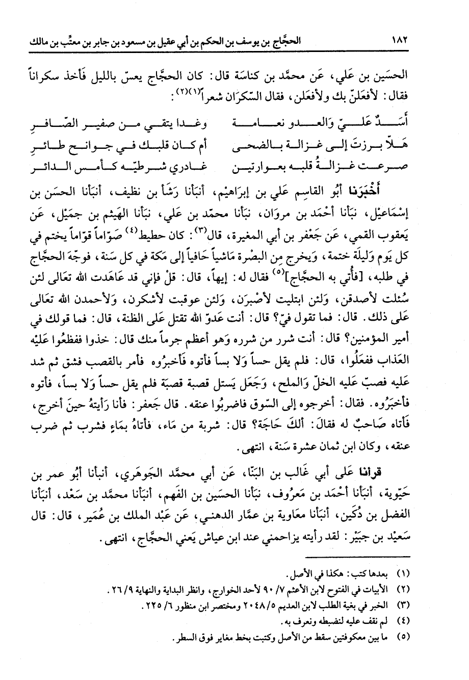 الحسين بن علي عن محمد بن كناسة قال كان الحجاج يعس بالليل فأخذ سكرانا فقال لأفعلن بك ولأفعلن فقال السكران شعرا (1) (2) * أسد علي والعدو نعامة * وغدا يتقي من صفير الصافر * هلا برزت إلى غزاله بالضحى * أم كان قلبك في جوانح طائر صرعت غزالة قلبه بعوارتين * غادري شرطيه كأمس الدائر * اخبرنا أبو القاسم علي بن إبراهيم أنبأنا رشأ بن نظيف أنبأنا الحسن بن اسماعيل نبأنا احمد بن مروان نبأنا محمد بن علي نبأنا الهيثم بن جميل عن يعقوب القمي عن جعفر بن أبي المغيرة قال (3) كان حطيط (4) صواما قواما يختم في كل يوم وليلة ختمه ويخرج من البصرة ماشيا حافيا إلى مكة في كل سنة فوجه الحجاج في طلبه فأتي به الحجاج (5) فقال له ايها قال قل فإني قد عاهدت الله تعالى لئن سئلت لاصدقن ولئن ابتليت لاصبرن ولئن عوقبت لاشكرن ولاحمدن الله تعالى على ذلك قال فما تقول في قال أنت عدو الله تقتل على الظنة قال فما قولك في أمير المؤمنين قال أنت شرر من شرره وهو اعظم جرما منك قال خذوا ففطعوا عليه العذاب ففعلوا قال فلم يقل حسا ولا بسا فأتوه فأخبروه فأمر بالقصب فشق ثم شد عليه فصب عليه الخل والملح وجعل يستل قصبة قصبة فلم يقل حسا ولا بسا فأتوه فأخبروه فقال أخرجوه إلى السوق فاضربوا عنقه قال جعفر فأنا رايته حين اخرج فأتاه صاحب له فقال الك حاجة قال شربة من ماء فأتاه بماء فشرب ثم ضرب عنقه وكان ابن ثمان عشرة سنة انتهى قرأنا على أبي غالب بن البنا عن أبي محمد الجوهري أنبأنا أبو عمر بن حيوية أنبأنا أحمد بن معروف نبأنا الحسين بن الفهم أنبأنا محمد بن سعد أنبأنا الفضل بن دكين أنبأنا معاوية بن عمار الدهني عن عبد الملك بن عمير قال قال سعيد بن جبير لقد رأيته يزاحمني عند ابن عياش يعني الحجاج انتهى