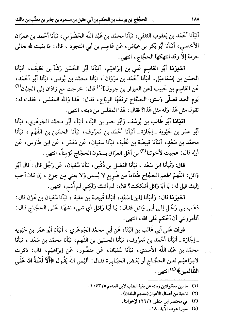 قرأت على أبي غالب بن البنا عن أبي محمد الجوهري أنبأنا أبو عمر بن حيوية اجازة أنبأنا احمد بن معروف نبأنا الحسين بن الفهم نبأنا محمد بن سعد نبأنا محمد بن عبد الله الاسدي نبأنا سفيان عن منصور عن إبراهيم قال ذكرت لابراهيم لعن الحجاج أو بعض الجبابرة فقال اليس الله يقول " إلا لعنة الله على الظالمين " (4) انتهى