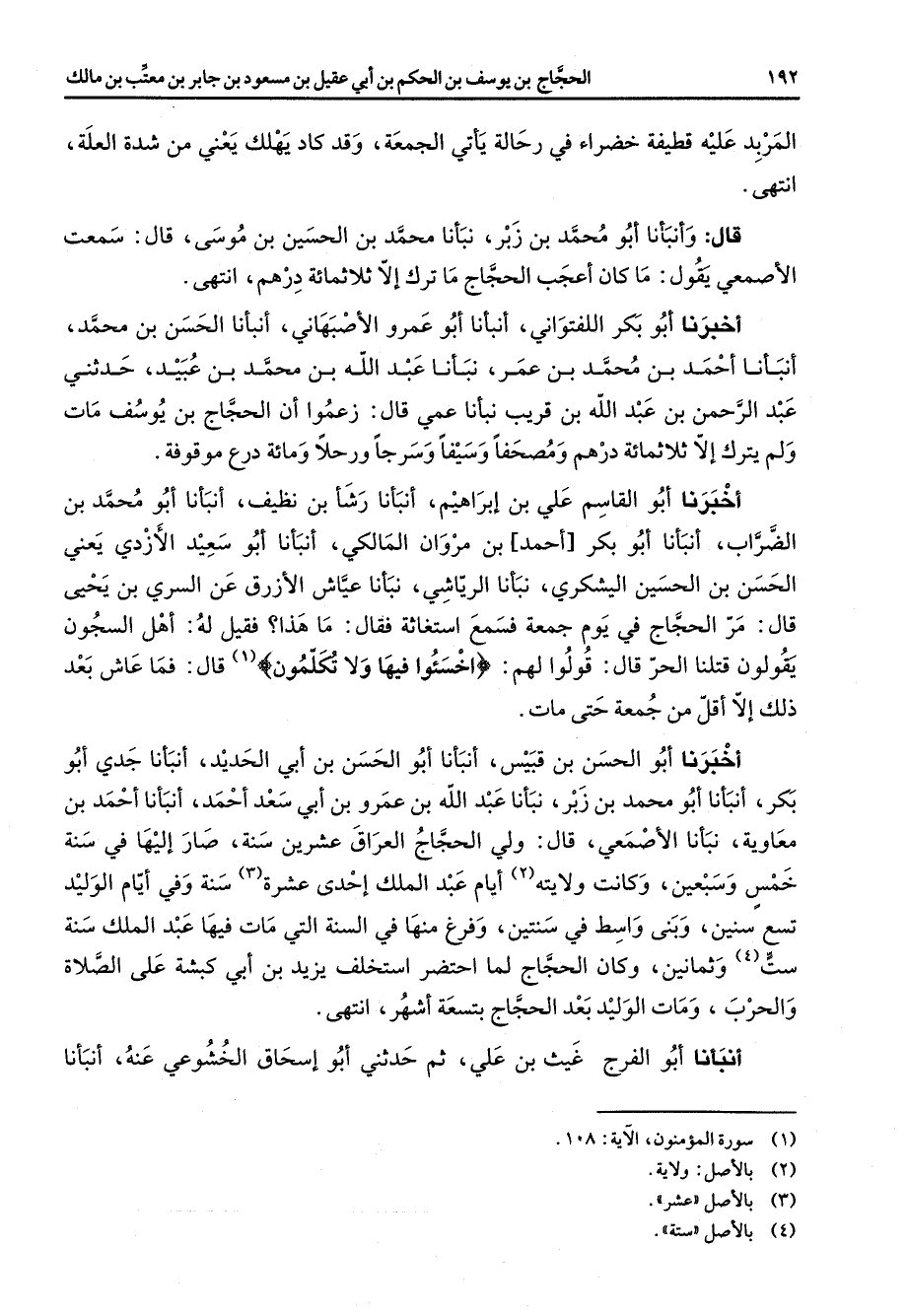 المربد عليه قطيفة خضراء في رحالة يأتي الجمعة وقد كاد يهلك يعني من شدة العلة انتهى قال وأنبأنا أبو محمد بن زبر نبأنا محمد بن الحسين بن موسى قال سمعت الأصمعي يقول ما كان اعجب الحجاج ما ترك إلا ثلاثمائة درهم انتهى اخبرنا أبو بكر اللفتواني أنبأنا أبو عمرو الاصبهاني أنبأنا الحسن بن محمد أنبأنا احمد بن محمد بن عمر نبأنا عبد الله بن محمد بن عبيد حدثني عبد الرحمن بن عبد الله بن قريب نبأنا عمي قال زعموا أن الحجاج بن يوسف مات ولم يترك إلا ثلاثمائة درهم ومصحفا وسيفا وسرجا ورحلا ومائة درع موقوفة اخبرنا أبو القاسم علي بن إبراهيم أنبأنا رشأ بن نظيف أنبأنا أبو محمد الضراب أنبأنا أبو بكر احمد بن مروان المالكي أنبأنا أبو سعيد الازدي يعني الحسن بن الحسين اليشكري نبأنا الرياشي نبأنا عياش الازرق عن السري ين يحيى قال مر الحجاج في يوم جمعة فسمع استغاثة فقال ما هذا فقيل له أهل السجون يقولون قتلنا الحر قال قولوا لهم " اخسئوا فيها ولا تكلمون " (1) قال فما عاش بعد ذلك إلا اقل من جمعة حتى مات اخبرنا أبو الحسن بن قبيس أنبأنا أبو الحسن بن أبي الحديد أنبأنا جدي أبو بكر أنبأنا أبو محمد بن زبر نبأنا عبد الله بن عمرو بن أبي سعد احمد أنبأنا احمد بن معاوية نبأنا الأصمعي قال ولي الحجاج العراق عشرين سنة صار إليها في سنة خمس وسبعين وكانت ولايته (2) أيام عبد الملك إحدى عشرة (3) سنة وفي أيام الوليد تسع سنين وبنى واسط في سنتين وفرغ منها في السنة التي مات فيها عبد الملك سنة ست (4) وثمانين وكان الحجاج لما احتضر استخلف يزيد بن أبي كبشة على الصلاة والحرب ومات الوليد بعد الحجاج بتسعة اشهر انتهى أنبأنا ومات أبو الفرج غيث بن علي ثم حدثني أبو إسحاق الخشوعي عنه أنبأنا