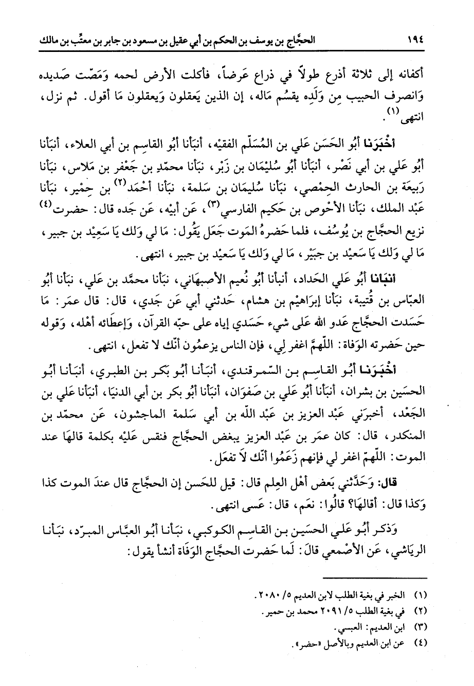 اخبرنا أبو الحسن علي بن المسلم الفقيه أنبأنا أبو القاسم بن أبي العلاء أنبأنا أبو علي بن أبي نصر أنبأنا أبو سليمان بن زبر نبأنا محمد بن جعفر بن ملاس نبأنا ربيعة بن الحارث الحمصي نبأنا سليمان بن سلمة نبأنا احمد (2) بن حمير نبأنا عبد الملك نبأنا الاحوص بن حكيم الفارسي (3) عن أبيه عن جده قال حضرت (4) نزيع الحجاج بن يوسف فلما حضره الموت جعل يقول ما لي ولك يا سعيد بن جبير مالي ولك يا سعيد بن جبير مالي ولك يا سعيد بن جبير انتهى أنبأنا أبو علي الحداد أنبأنا أبو نعيم الاصبهاني نبأنا محمد بن علي نبأنا أبو العباس بن قتيبة نبأنا إبراهيم بن هشام حدثني أبي عن جدي قال قال عمر ما حسدت الحجاج عدو الله على شئ حسدي إياه على حبه القرآن واعطائه أهله وقوله حين حضرته الوفاة اللهم اغفر لي فان الناس يزعمون انك لا تفعل انتهى اخبرنا أبو القاسم بن السمرقندي أنبأنا أبو بكر بن الطبري أنبأنا أبو الحسين بن بشران أنبأنا أبو علي بن صفوان أنبأنا أبو بكر بن أبي الدنيا أنبأنا علي بن الجعد اخبرني عبد العزيز بن عبد الله بن أبي سلمة الماجشون عن محمد بن المنكدر قال كان عمر بن عبد العزيز يبغض الحجاج فنقس عليه بكلمة قالها عند الموت اللهم اغفر لي فإنهم زعموا انك لا تفعل قال حدثني بعض أهل العلم قال قيل للحسن أن الحجاج قال عند الموت كذا وكذا قال اقالها قالوا نعم قال عسى انتهى وذكر أبو علي الحسين بن القاسم الكوكبي نبأنا أبو العباس المبرد نبأنا الرياشي عن الأصمعي قال لما حضرت الحجاج الوفاة انشأ يقول: